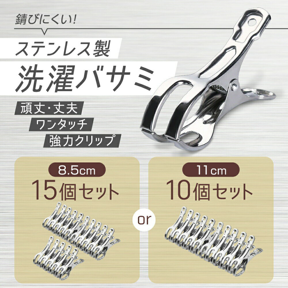 \楽天ポイント10倍!/洗濯ばさみ ステンレス 15個セット 強力 大口サイズ クリップ 洗濯物 固定 防風 布団 竿ばさみ ワンタッチ 物干し ピンチ 物干し竿 部屋干し 室内 錆びにくい 屋外 ベランダ ハンガー タオル 洗濯用品 デニム コート 日用品 BB