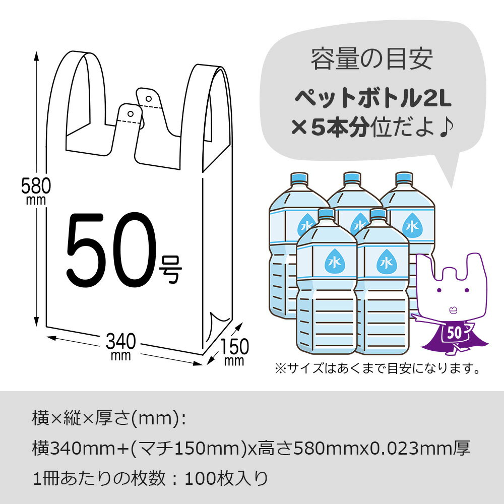 商品番号 RH-50 横×縦×厚さ(mm) 490(340+150)x580x0.023(マチ150) 1冊あたりの枚数 100枚入り 1箱あたりの冊数(合計枚数) 20冊入り(2,000枚/箱) 色 半透明 材質 HDPE 日々の生活の必需品!厚手・半透明タイプのレジ袋3Lサイズです。 お買い物袋としてはもちろん、ごみ袋としても重宝するレジ袋は毎日の生活に欠かせません! 1冊100枚入りなので毎日使いでも買い替えの手間が省けます! 吊り下げてミシン目から切り離して使用でき、保管・取り出しに便利です。 \こんな時におすすめ!/ ・お買い物袋として役立ちます。 ・室内のゴミ箱用、車内のゴミ入れとして活用できます。 ・収納・保管袋としても使える、便利な大きめサイズです。レジ袋厚手タイプ 西日本50号(東日本60号) 0.023mm厚 半透明 ケース(箱)