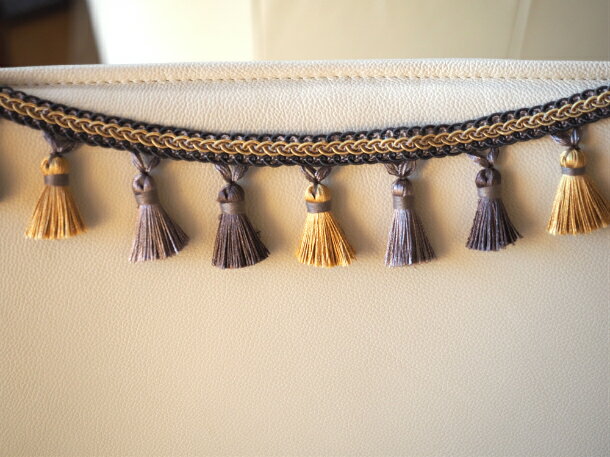 3色(グレー×マスタード×シルバーグレー)タッセルブレード 個性的な3色の配色が目を惹く、おしゃれなタッセル付きブレードです。 タッセルのカラーは (1)グレー(2)マスタード(3)シルバーグレー。 相性抜群の3色のコントラストは、1色だけでは出せない色のパワーを感じさせてくれます。 ご注文は20センチ単位で承ります。 ・タッセルの縦の長さは約45ミリ。 ※タッセルだけ取り外して使うこともできます。軽量で、使いやすいサイズです。 ひとさし指の爪から第二関節ぐらいの長さです。 ・ブレードの端からタッセルの先端までの全長は約65ミリです。 関連:ブレード リボン テープ タッセル フリンジ 房 ふさ カーテン 素材 材料 ピアス パーツ デコレーション イヤリング カルトナージュ おしゃれ イエローゴールド 金 グレー シルバー 飾り かざり 手芸 縁 ふち 縁どり 縁取り ふちどり かごバッグ マルシェバッグ