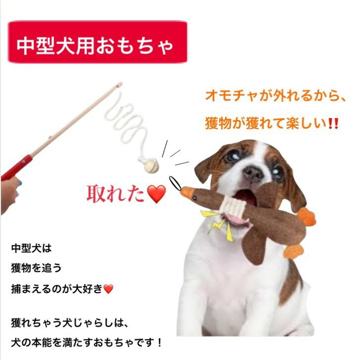 犬おもちゃ 中型犬おもちゃ おもちゃがとれちゃう犬じゃらし【小型犬中型犬】 犬のおもちゃ 犬のおやつ 犬のしつけ 犬のいたずら 猫じゃらし 犬じゃらし 中型犬 犬と遊ぶ 【楽しみながら愛犬の運動量を確保できる! 愛犬の本能を満たしてあげるおもちゃです!!】通常の猫じゃらし・犬じゃらしは羽やおもちゃがヒモに繋がれ、外れない構造です。Hunt the Toyシリーズのこの犬じゃらしは、振り回しても外れないのに、犬が咥えた弾みの力でおもちゃが外れます!だから犬の好きな狩りができちゃう!人間社会・飼い主さんの指示に従う健気なワンコたち。遊ぶ時は思いっきり本能を満たす遊びをしてあげたい!!室内でもワクワクしながら運動をさせてあげたい!!新しい遊びをしてあげたい!!そんな飼い主さまへお勧めします。おもちゃが外れるので、愛犬は達成感で満たされます!小型犬・中型犬で15キロ以下(目安)犬に適したおもちゃです。取り外し可能なので一つのおもちゃで何度でも新鮮な遊びが楽しめます!犬は飼い主さんと遊ぶのが大好き。ママやパパが喜ぶことは何でもするよ!引っ張りっこも取ってこいも大好き。でも・・・本能を満たしてくれる【とれちゃう犬じゃらし】は最高だワン!複雑に逃げる獲物を捕りたい、捕まえたい、おもちゃが取れた快感が最高にストレス発散だワン!!こんなおもちゃが欲しかったぁ~そんなワン声が聞こえてきそうな新しい犬のおもちゃ【とれちゃう犬じゃらし】犬が獲物を追いかけている時の心理は、怒りとは真逆のドキドキ・ワクワク感だといいます。獲物を追うことが楽しい !!野生の犬にとって探索欲を駆り立てられるのが「獲物」だったわけで、獲物を探す→獲物を追う→とどめを刺す、この3つの工程が犬にとっては楽しいのです。人間と暮らす犬は、飼い主に毎日餌を与えられるため、獲物を追って捕食する必要がありません。しかし、犬には「追跡本能」と「捕食本能」があるため、おもちゃやボール、スリッパ、クッションなどを咥えて離さない、振り回すなどの行為は、自ら本能を満たそうとする行為のひとつといえるでしょう。困った行動を止めるより、これならいいよ!っと決めて、欲求を満たしてあげる方が愛犬にとっても、人にとってもより幸せだと思うのです。スリッパやおもちゃを咥えるのは「遊んで~♪」のサインともいえます。冬で寒く、お散歩に行けない日や運動量が減少しがちな時は、愛犬もストレスが溜まりやすくなる季節・・・お気に入りのおもちゃ、ボールを投げて「取ってこい!」の室内遊びがいいですね。そして最後に【おもちゃが獲れちゃう犬じゃらし】で本能を満たしてあげて、より犬が求める快感を遊びの中に加えてあげてはいかがでしょうか。使用者の巧みな操作で複雑に動く獲物(人形)を狩るには犬の頭脳がフル回転します。思わぬ愛犬の頭の良さに驚かされる事でしょう。小犬にはゆっくりと、成長するにつれて愛犬の能力に合わせて動かせば、飽きることなく遊べ、飼い主様との絆も深まり愛犬は幸せをより感じることのできるおもちゃです。自分の力で複雑に逃げるおもちゃが獲れた時の快感は他のおもちゃでは得られない達成感を得るでしょう。褒められ、身体も心も満たされてぐっすり寝る愛犬の寝顔は格別ですよ。あなたの愛犬はどんな喜び方をするでしょう。今年のクリスマス・正月のプレゼントにお勧めです!!ぜひ、お試しください。※PCT出願済み※映像の床はクッション性のあるマットを使用しています。 5