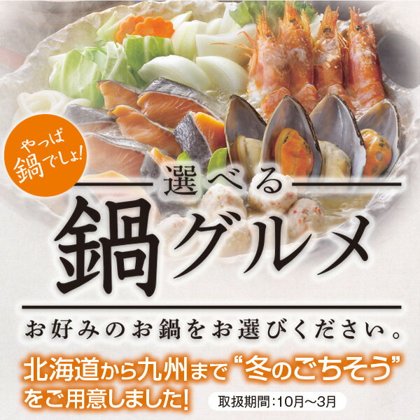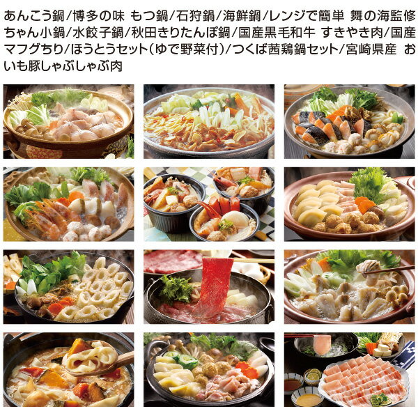 ●システム料1000円(税抜価格)が含まれております。●商品及び商品内容は予告なく変更する場合があります。●秋田きりたんぽ鍋、あんこう鍋、イベリコ豚しゃぶしゃぶ肉、国産マフグちり、水餃子鍋、大分県産カンパチしゃぶしゃぶセット、博多の味 モツ鍋、国産黒毛和牛すきやき肉、国産黒毛和牛すきやき肉、石狩鍋、宮崎県産おいも豚しゃぶしゃぶ肉、つくば茜鶏鍋セット、海鮮鍋お好きなお鍋を1点チョイス!!
