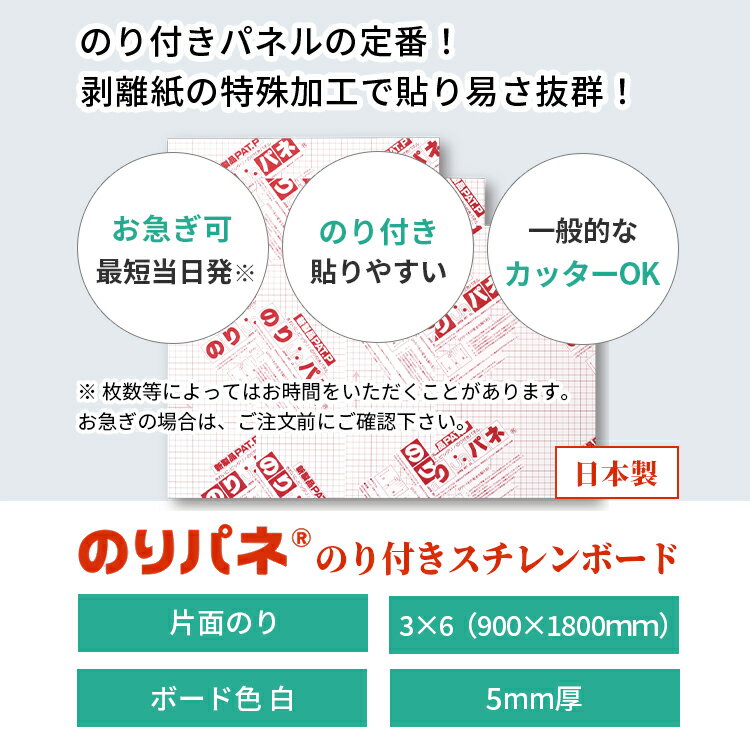 よく一緒に購入されている商品スチレンボード 発泡スチロール 板 5mm A391円スチレンボード 発泡スチロール 板 5mm A218円スチレンボード 発泡スチロール 板 5mm B1,729円 商品名 のりパネ 5mm 3×6サイズ (900×1800mm)5枚組 特徴 ■ 軽くて丈夫な発泡ボードの片面に強力接着剤を塗布した、のり付きスチレンボードのベストセラー。 ■ 剥離紙をはがし、POP・ポスター・写真・インクジェット出力紙を貼り付けるだけで簡単にディスプレイ。 ■ 剥離紙は特殊加工で手で簡単に裂けるので、貼り易さ抜群。 ■ ボードは、カッター等で簡単にカットできます。 仕様 サイズ:3×6サイズ (900×1800mm) 厚さ:5mm 重量:1200g 粘着面:片面 ボードカラー:白 サイズについて ボードサイズは一般的な貼り付け作業、及び配送時の角の破損を考慮し、仕様にあるサイズより大き目となっております。 加工等 以下のご要望承れますので、ご希望の際は、ご注文前にご相談ください。 ■ ご指定サイズへのカット。(一辺が200mm以上) ■ A1などの規格サイズぴったりカット。 ■ ご支給印刷物の貼付け。(一辺が200mm以上、枚数は50枚以上) ※ご指定サイズやぴったりサイズのカットは、3営業日前後で発送いたします 【本品の呼び方、名称】 スチレンボード スチレン 発泡ボード 発泡スチロール板 発泡スチロール 発泡プラスチック 発泡板 ボード 貼りパネル ポリスチレンフォーム 画材 のりパネ アルテ 【製品特徴、材質】 屋内 軽量 板 のり 切りやすい カットしやすい 加工しやすい 使いやすい 粘着 簡単 大量 即納 高密度 作業 圧縮 【ご利用の場所 ご利用者】 スーパー 店舗 店頭 商店街 居酒屋 公共施設 オフィス 事務所 美術館 写真展 ゲームセンター アミューズメント パチンコ 遊技場 展覧会 展示会 陳列棚 イベント レジ サービスカウンター 結婚式 ドラッグストア 量販店 【ご用途】 工作 POP ポップ 写真 ポスター DIY プレゼンテーション 発表 建築模型 鉄道模型 模型 作品 ネームプレート 値札 卒業制作 作品展示 看板芯材 看板素材 フリップボード 名札 ウォールアート 台紙 ウェディングボード ウェルカムボード ロゴ 裏板 土台 立て看板 類似商品はこちらスチレンボード 発泡スチロール 板 7mm 320,405円スチレンボード 発泡スチロール 板 5mm 325,487円スチレンボード 発泡スチロール 板 7mm 330,569円スチレンボード 発泡スチロール 板 5mm B527円スチレンボード 発泡スチロール 板 5mm A391円スチレンボード 発泡スチロール 板 5mm A2,364円スチレンボード 発泡スチロール 板 5mm B1,729円スチレンボード 発泡スチロール 板 5mm A1,221円スチレンボード 発泡スチロール 板 5mm B924円新着商品はこちら2025/11/19バリウエイト イエロー 注水式ウエイト 満水時1,830円2025/11/15水タンク BW-BS 満水時3kg 注水式ウエ1,650円2025/11/15キューブブロック スチール製ウエイト 2.8k6,570円再販商品はこちら2025/11/20消毒液 スタンド 難防止金具付き I型AS-013,463円2025/11/18駐車場 看板 MPSマルチポップスタンド用 面4,636円2025/11/13スタックウエイト大 満水時10.5kg 注水式1,848円2025/11/20 更新 緑枠が今ご覧いただいているページの商品です。