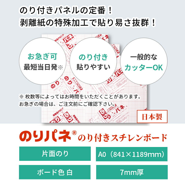 よく一緒に購入されている商品スチレンボード 発泡スチロール 板 7mm A306円スチレンボード 発泡スチロール 板 7mm A1,517円スチレンボード 発泡スチロール 板 1mm A1,246円 商品名 のりパネ 7mm A0(841×1189mm) 特徴 ■ 軽くて丈夫な発泡ボードの片面に強力接着剤を塗布した、のり付きスチレンボードのベストセラー。 ■ 剥離紙をはがし、POP・ポスター・写真・インクジェット出力紙を貼り付けるだけで簡単にディスプレイ。 ■ 剥離紙は特殊加工で手で簡単に裂けるので、貼り易さ抜群。 ■ ボードは、カッター等で簡単にカットできます。 仕様 サイズ:A0サイズ(841×1189mm) 厚さ:7mm 重量:960g 粘着面:片面 ボードカラー:白 サイズについて ボードサイズは一般的な貼り付け作業、及び配送時の角の破損を考慮し、仕様にあるサイズより大き目となっております。 加工等 以下のご要望承れますので、ご希望の際は、ご注文前にご相談ください。 ■ ご指定サイズへのカット。(一辺が200mm以上) ■ A1などの規格サイズぴったりカット。 ■ ご支給印刷物の貼付け。(一辺が200mm以上、枚数は50枚以上) ※ご指定サイズやぴったりサイズのカットは、3営業日前後で発送いたします 【本品の呼び方、名称】 スチレンボード スチレン 発泡ボード 発泡スチロール板 発泡スチロール 発泡プラスチック 発泡板 ボード 貼りパネル ポリスチレンフォーム 画材 のりパネ アルテ 【製品特徴、材質】 屋内 軽量 板 のり 切りやすい カットしやすい 加工しやすい 使いやすい 粘着 簡単 大量 即納 高密度 作業 圧縮 【ご利用の場所 ご利用者】 スーパー 店舗 店頭 商店街 居酒屋 公共施設 オフィス 事務所 美術館 写真展 ゲームセンター アミューズメント パチンコ 遊技場 展覧会 展示会 陳列棚 イベント レジ サービスカウンター 結婚式 ドラッグストア 量販店 【ご用途】 工作 POP ポップ 写真 ポスター DIY プレゼンテーション 発表 建築模型 鉄道模型 模型 作品 ネームプレート 値札 卒業制作 作品展示 看板芯材 看板素材 フリップボード 名札 ウォールアート 台紙 ウェディングボード ウェルカムボード ロゴ 裏板 土台 立て看板 類似商品はこちらスチレンボード 発泡スチロール 板 5mm A2,364円スチレンボード 発泡スチロール 板 7mm A4,397円スチレンボード 発泡スチロール 板 7mm A1,517円スチレンボード 発泡スチロール 板 5mm 3,550円スチレンボード 発泡スチロール 板 7mm A798円スチレンボード 発泡スチロール 板 7mm A484円スチレンボード 発泡スチロール 板 7mm A306円スチレンボード 発泡スチロール 板 5mm A1,221円スチレンボード 発泡スチロール 板 7mm A3,450円新着商品はこちら2025/11/19バリウエイト イエロー 注水式ウエイト 満水時1,830円2025/11/15水タンク BW-BS 満水時3kg 注水式ウエ1,650円2025/11/15キューブブロック スチール製ウエイト 2.8k6,570円再販商品はこちら2025/11/20消毒液 スタンド 難防止金具付き I型AS-013,463円2025/11/18駐車場 看板 MPSマルチポップスタンド用 面4,636円2025/11/13スタックウエイト大 満水時10.5kg 注水式1,848円2025/11/20 更新 緑枠が今ご覧いただいているページの商品です。