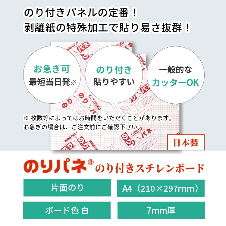 よく一緒に購入されている商品スチレンボード 発泡スチロール 板 7mm A484円スチレンボード 発泡スチロール 板 7mm A1,517円スチレンボード 発泡スチロール 板 7mm B383円 商品名 のりパネ 7mm A4(210×297mm) 特徴 ■ 軽くて丈夫な発泡ボードの片面に強力接着剤を塗布した、のり付きスチレンボードのベストセラー。 ■ 剥離紙をはがし、POP・ポスター・写真・インクジェット出力紙を貼り付けるだけで簡単にディスプレイ。 ■ 剥離紙は特殊加工で手で簡単に裂けるので、貼り易さ抜群。 ■ ボードは、カッター等で簡単にカットできます。 仕様 サイズ:A4サイズ(210×297mm) 厚さ:7mm 重量:67g 粘着面:片面 ボードカラー:白 サイズについて ボードサイズは一般的な貼り付け作業、及び配送時の角の破損を考慮し、仕様にあるサイズより大き目となっております。 加工等 以下のご要望承れますので、ご希望の際は、ご注文前にご相談ください。 ■ ご指定サイズへのカット。(一辺が200mm以上) ■ A1などの規格サイズぴったりカット。 ■ ご支給印刷物の貼付け。(一辺が200mm以上、枚数は50枚以上) ※ご指定サイズやぴったりサイズのカットは、3営業日前後で発送いたします 【本品の呼び方、名称】 スチレンボード スチレン 発泡ボード 発泡スチロール板 発泡スチロール 発泡プラスチック 発泡板 ボード 貼りパネル ポリスチレンフォーム 画材 のりパネ アルテ 【製品特徴、材質】 屋内 軽量 板 のり 切りやすい カットしやすい 加工しやすい 使いやすい 粘着 簡単 大量 即納 高密度 作業 圧縮 【ご利用の場所 ご利用者】 スーパー 店舗 店頭 商店街 居酒屋 公共施設 オフィス 事務所 美術館 写真展 ゲームセンター アミューズメント パチンコ 遊技場 展覧会 展示会 陳列棚 イベント レジ サービスカウンター 結婚式 ドラッグストア 量販店 【ご用途】 工作 POP ポップ 写真 ポスター DIY プレゼンテーション 発表 建築模型 鉄道模型 模型 作品 ネームプレート 値札 卒業制作 作品展示 看板芯材 看板素材 フリップボード 名札 ウォールアート 台紙 ウェディングボード ウェルカムボード ロゴ 裏板 土台 立て看板 類似商品はこちらスチレンボード 発泡スチロール 板 5mm A218円スチレンボード 発泡スチロール 板 7mm A484円スチレンボード 発泡スチロール 板 7mm 421円スチレンボード 発泡スチロール 板 7mm A2,957円スチレンボード 発泡スチロール 板 7mm A1,517円スチレンボード 発泡スチロール 板 7mm A798円スチレンボード 発泡スチロール 板 7mm B383円スチレンボード 発泡スチロール 板 5mm A391円スチレンボード 発泡スチロール 板 5mm 331円新着商品はこちら2025/11/19バリウエイト イエロー 注水式ウエイト 満水時1,830円2025/11/15水タンク BW-BS 満水時3kg 注水式ウエ1,650円2025/11/15キューブブロック スチール製ウエイト 2.8k6,570円再販商品はこちら2025/11/20消毒液 スタンド 難防止金具付き I型AS-013,463円2025/11/18駐車場 看板 MPSマルチポップスタンド用 面4,636円2025/11/13スタックウエイト大 満水時10.5kg 注水式1,848円2025/11/23 更新 緑枠が今ご覧いただいているページの商品です。