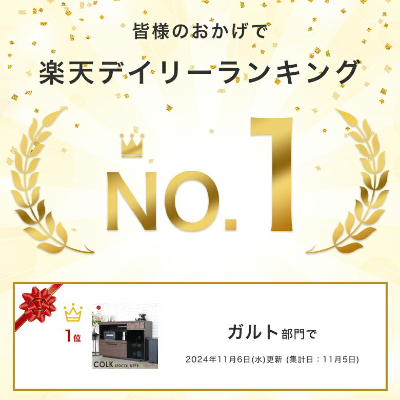 下記地域は、追加送料が発生いたします。 北海道・東北・沖縄・離島 ※東北地方へのお届けは一部送料無料商品もございます。 詳しくは送料料金表をご確認下さいませ。 商品サイズ [ 外寸 ] 全体:幅120×奥行き44.5×高さ85cm [ 内寸 ] 左側オープン部:幅74×奥行40.5×高さ37cm 右小引出:幅31.5×奥行33.8×高さ5.8cm 左大引出:幅70.5×奥行33.8×高さ17cm 右ガラス扉内:幅36×奥行35.4×高さ59.7cm [ スライド棚引出し量 ] 天板下スライド:前板より22.5cm オープン部スライド:前板より23.5cm 材質 本体:強化紙 引出前板:アルダー材 (オイル塗装) ガラス:4mm強化ダークグレーガラス 商品詳細 日本製 完成品 ※取手のみ取り付け 重量:約49kg 天板耐荷重:約15kg 右棚板耐荷重:約5kg スライド棚耐荷重:約5kg 2口コンセント付き カテゴリ 木 ロー ローラック キャビネット レンジ 収納棚 一人暮らし 幅 120 扉 扉付き 組立不要 キッチンカウンター 120 の解説 落ち着いたモダンな空間を演出する、多彩な収納スタイルが特徴の大容量キッチンカウンター。 おしゃれなタイルチップ上のデザインに機能性も充実しています。 熟練の家具職人が丁寧に作り上げた、精巧で完成度の高い「日本製」家具。 届いたその日からすぐにご使用いただくことができる完成品でお届けいたします。 引き出しの前板にはアルダー無垢材をタイルチップ上に配置し、凹凸感と天然木ならではの風合いを楽しむことができます。 天板や前板には天然木に合わせた木目調シート、内装にはブラックカラーを配することで落ち着いた大人のデザインに仕上がりました。 天板下には使いたいときにさっと引き出せるスライドトレーが付いていてちょい置きスペースとして活躍してくれます。 オープンスペースは炊飯器やトースターなどの家電収納に便利なスライド棚付きで、2口コンセントが付いているので複数の家電を設置することも可能です。 2杯の引き出しはいずれもフルスライドレール付きで中身が入ってもスムーズにスライドしてくれるので、毎日ストレスなしで使用できます。 ガラス扉内の収納スペースは6段階に高さ調節できる可動棚が2枚付いているので、収納したいものに合わせて調節が可能です。 幅120サイズのご家庭で設置しやすいサイズ感ながらも大容量の収納と多彩な機能性で人気のロングセラー商品。 落ち着いたモダンテイストから、シンプルベーシック、ナチュラルテイストなど幅広いテイストのキッチンにマッチする馴染みやすいデザインです。 購入前の注意事項 天然木使用のため木目の柄には個体差がありますので予めご了承ください。 搬入経路が確保できずにキャンセルとなった場合は、キャンセル料が発生致しますのでご注意ください。 欠品・完売の場合は、その旨ご連絡させていただきます。 写真と実際の色が異なって見える場合がございます。 恐れ入りますがあらかじめご了承下さい。 [kc_120] COLK 120KITCHENCOUNTERおすすめのキッチンカウンター ついで買い!ダストボックス ★ 当店イチオシ!LINE UP ★ ページトップ 商品ページトップ サイズ Potarico Publicc