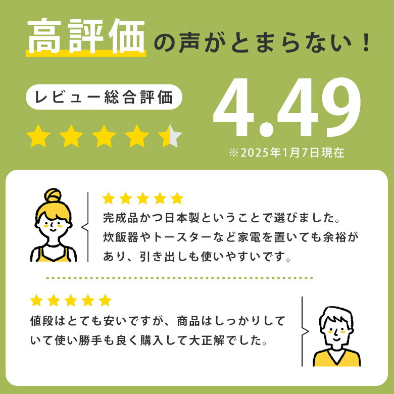 下記地域は、追加送料が発生いたします。 北海道・東北・沖縄・離島 ※東北地方へのお届けは一部送料無料商品もございます。 詳しくは送料料金表をご確認下さいませ。 サイズ [ 幅90cm ] 幅90×奥行き40×高さ89cm 下段扉内内寸:幅24×奥行き37×高さ60cm(3cm間隔3段 棚板2枚) 商品重量:約29kg [ 幅120cm ] 幅119×奥行き40×高さ89cm 下段扉内内寸:幅50×奥行き37×高さ60cm(3cm間隔3段 棚板2枚) 商品重量:約32kg 梱包重量:約35kg [ 共通 ] 上段引出内寸:幅23×奥行き33.5×高さ10cm(有効高11cm) オープン部内寸:幅55×奥行36.5×高さ40cm(スライド棚:最大25cm引出し可能) 右下引出:幅50.2×奥行33.5×高さ14cm(有効高25.5cm) 材質 プリント化粧合板 特徴 完成品 日本製 1500Wコンセント2口付き 天板耐荷重:約30kg 引出/スライド棚耐荷重:約5kg 説明 清潔感あふれる真っ白なデザインのレンジカウンター。引き出し収納と可動棚が付いた扉内収納、さらにスライド棚が付いたオープンスペースが備わって、抜群の使い心地です。同シリーズの商品と並べて置くのもオススメです! カテゴリ ロー ローラック キャビネット コンパクト シンプル モダン 収納棚 一人暮らし 国産 幅 120 90 大容量 扉 作業台 組立不要 購入前の注意事項 搬入経路が確保できずにキャンセルとなった場合は、キャンセル料が発生致しますのでご注意ください。 欠品・完売の場合は、その旨ご連絡させていただきます。 写真と実際の色が異なって見える場合がございます。 恐れ入りますがあらかじめご了承下さい。 [kc_120]スライス_シリーズ ★ 当店イチオシ!LINE UP ★