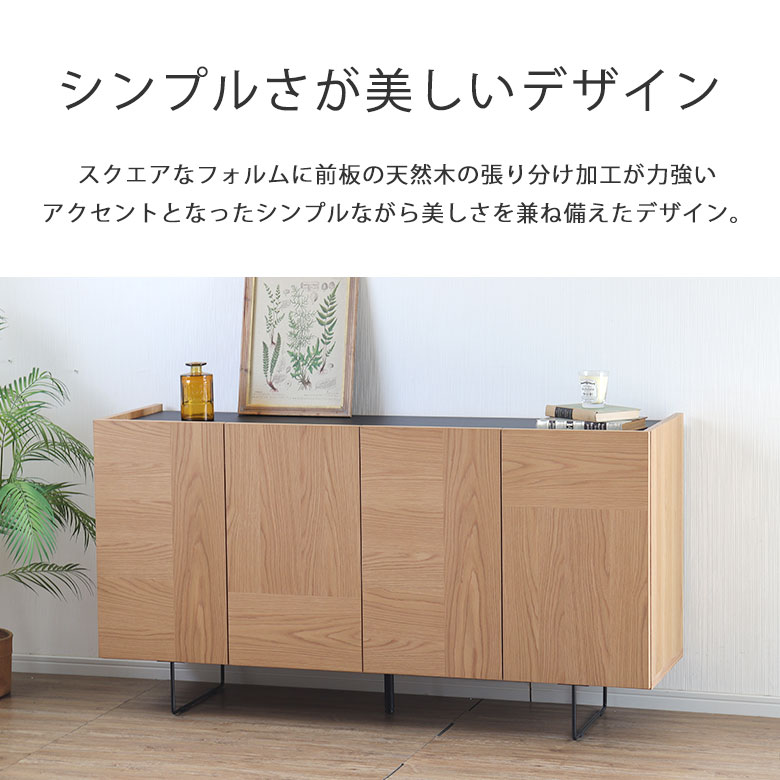 ■下記地域は、追加送料が発生いたします。 北海道・東北・沖縄・離島 ※東北地方へのお届けは一部送料無料商品もございます。 詳しくは送料料金表をご確認下さいませ。 ■商品サイズ [75サイズ] 本体:幅75×奥行44.5×高さ80cm 天板スペース(黒部分):幅70.8×奥行42.5cm [150サイズ] 本体:150×奥行44.5×高さ80cm 天板スペース(黒部分):幅約150×奥行42.5cm ※脚高15.3cm 扉内(左右共通):幅66×奥行41.2×高さ58.3cm ■材質 天板:オレフィン 側面・内装:プリント紙化粧合板 前板:(ブラウン)ウォールナット突板/(ナチュラル)オーク突板・ウレタン塗装 脚部:スチール・粉体塗装 扉:ソフトクロージング仕様 ■商品詳細 可動棚4枚 完成品※脚のみお客様取り付け 日本製 [耐荷重]天板:約20kg/棚板:約5kg ■スタッフレビュー ○… スクエアなフォルムに前板の張り分け加工が力強いアクセントとなったデザイン。 繊細なスチール脚と天板の黒色が前板の力強さをより引き立たせ、 高級感のあるサイドボードに仕上げています。 △… 撮影及び表示画面の関係で、実際の色と異なって見える場合がございます。 [cab_120]デルノ シリーズ ★ 当店イチオシ!LINE UP ★