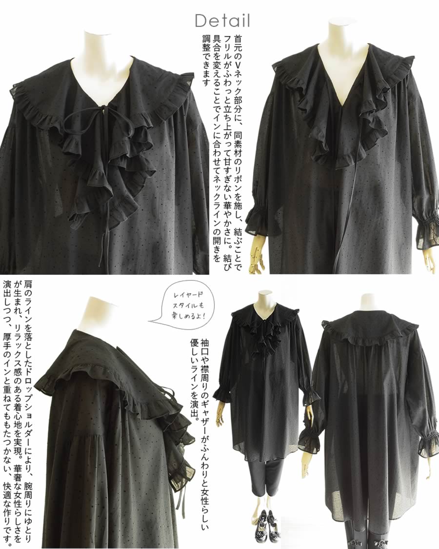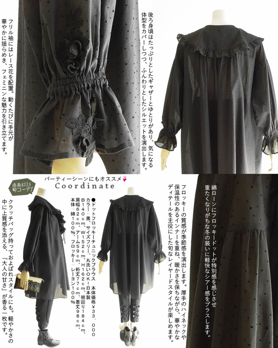 【日本製 洗える】綿100% ロング ブラウス 長袖 レディース トップス 春 夏 秋 冬 厚手 レディース/ブラウス/プルオーバー/無地/ブラウス チュニック/パーティー/ウォッシャブル フリル 黒 ドット 【ベルパーチ】ドットフロッキーチュニックブラウス
