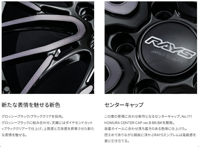 ■商品詳細メーカー名:RAYS (レイズ)商品名:2x10BD BLACK CLEAR EDITION (ホムラ 2×10BD ブラッククリア エディション)カラー:グロッシーブラック/ブラッククリア (BFJ)サイズ:18インチ 8.0J PCD:114.3 穴数:5 inset:45ハブ径:φ73.1FACE:F2■ご注意サイズ、ハブ径等は、2025年1月現在のメーカーホームページに基づきます。ホームページが修正となる場合がございます。ご注文前に、メーカーホームページにて詳細をご確認くださいますようお願い申し上げます。■適応について・お問い合わせは、ご注文前にお願いいたします。・純正からのインチダウンは適合未確認となりますのでご注意下さいませ。・お問い合わせの際は、車種/型式/年式/新車時タイヤサイズ/駆動方式/グレード等をご記載下さいませ。■ご注意■送料について・4本(1台分)ご購入の場合は 送料無料にてご対応をさせていただきます。・1台分お求めでない場合、1本あたり1,500円の送料が発生いたします。・1台分お求めの場合で、ご注文時に送料が表示されました場合、ご注文確認後 弊社にて送料無料へ修正いたします。■画像について・画像はイメージです。インチ数、ナットホール数(4穴、5穴等)は商品名通りです。・また 商品画像は共通画像となっております。サイズにより、デザイン・形状・色合い等が異なる場合が御座います。予めご了承ください。・タイヤ・ナット等は含まれません。■返品/キャンセルについて・お客様の思い違いによるミスマッチの返品には応じられませんので、適合をよくご確認の上お求め願います。■納期について・商品はメーカーさんよりお取り寄せとなります。・メーカー欠品時を除き 4〜5営業日(土・日・祝日・メーカー休業日除く)ほどで出荷となります。・メーカー欠品、生産中止等で入荷に見込みがございません場合は キャンセルとさせていただく場合がございます。予めご了承ください。