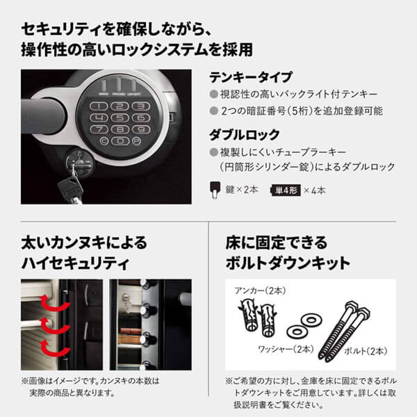 商品説明★ 過酷な米国UL2時間耐火テスト、爆発テストに合格★ 火災時の消火放水や浸水などの水害から守る耐水性能付★ 熱に弱いCD/DVD/USBメモリなどを守るデジタルメディア耐火性能認定品★ 太く頑丈な複数本のカンヌキと、こじ開け防止機構を備えた蝶番による強固なつくり★ 暗部でも視認性の高いバックライト付テンキーを採用。特殊な形状の鍵付で安心のダブルロックタイプ★ 扉裏に扉が開くと自動点灯するライト付★ A4ハードファイルが収納可能★ 整理がしやすい鍵付ドロワーとトレイ付★ ドア裏に便利な収納スペース、鍵フック付スペック* 外寸:約W472×D491×H603mm* 内寸:約W365×D280×H498mm* 質量:約75kg* 容量:約56.6リットル* 付属品:鍵2本、トレイ1個、鍵付ドロワー1個(ドロワー用鍵2本付)、取扱説明書・保証書、単4乾電池4本(モニター用)* ロック方式:テンキー+チューブラキー2時間耐火・耐水金庫ビッグボルト[ JTW ]シリーズラインナップJTW205GGL容量:約56.6LJTW123GEL容量:約33.6LJTW082GEL容量:約22.8L