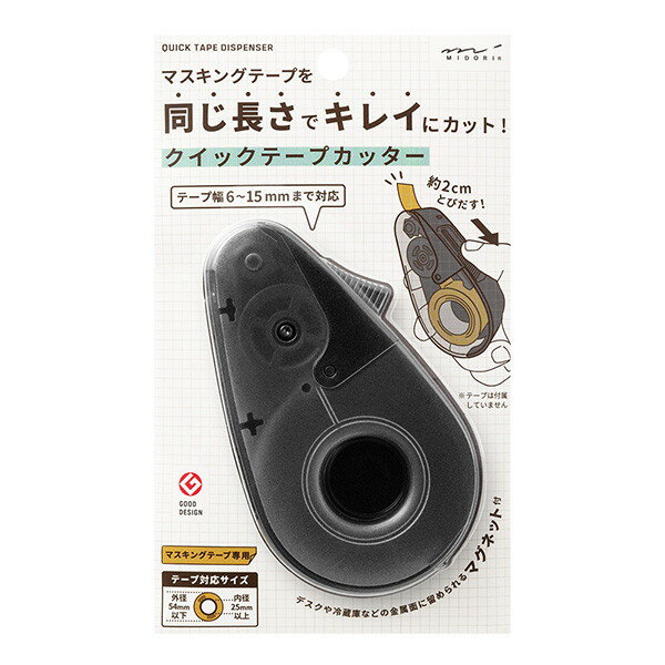 商品説明★ 片手で簡単に使えます。マスキングテープを素早く送りだし、軽い力で切り口をキレイにカットできる、マスキングテープ専用のディスペンサーです。マスキングテープを使うときに困りがちな、テープの切り口を見つける作業や、手で切ることで切り口が汚くなってしまうことなどを解消してくれる便利なアイテムです。ラッピングの留めシール用としてはもちろん、さまざまな用途でお使いいただけます。・オフィスにて共用のマスキングテープカッターとして。(プレゼンシートや資料を壁に貼ったり)・キッチン冷蔵庫内の整理整頓用のラベリングとして。(プロシェフも一般主婦も)・DIY・趣味や塗装用のマスキングとして。・雑貨店などの紙袋の封留め用に。軽い力できれいにカットが出来ます。★ スライダーを1回引く毎にマスキングテープを約2cm送りだすので、簡単に均一の長さで連続してカットすることができます。★ テープ出口の上側にカッター刃が付いていて、テープを上側にひねるように引くと、軽い力でテープをきれいにカットできます。★ 自由な長さでも引き出せます。★ テープを引っ張り自由な長さに引きだすことも可能です。★ 本体を立ててひねると、簡単にテープをカットできます。★ マグネット内蔵です。マグネットが内蔵されているので、冷蔵庫や金属製のドアや棚、机の脚などに留めることができ、保管場所にも困りません。スペック* パッケージサイズ:H158×W95×D26mm* 本体/H102×W58×D25mm* 素材/ポリカーボネート+POM +シリコン マグネット内蔵 ※マスキングテープは付属していません