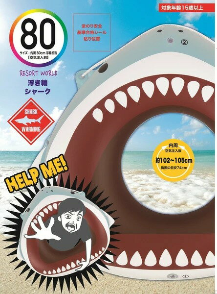 高校生ぐらい〜大人までに最適で、サメの顔を形どったユニーク浮輪。 ガブッと食われる感覚を写真に。 2気室・ロープ付き 対象年齢:12才以上 胸囲目安:78cmくらい 本品は “STマーク” が付いています。 “STマーク”とは、日本玩具協会が認定した、おもちゃの安全基準に合格した玩具につける 安全玩具マークです。 サイズ・容量 本体:80cm 本体内周(空気注入後):102~105cm ■生産地:中国 ■素材・成分:本体・空気栓:塩化ビニール(PVC) ロープ:ポリプロピレン(PP) 注意事項 サイズの表記は目安となっております。 空気の量やビニールの伸縮によりサイズが異なります。 「モニターの発色の具合によって実際のものと色が異なる場合がございます」