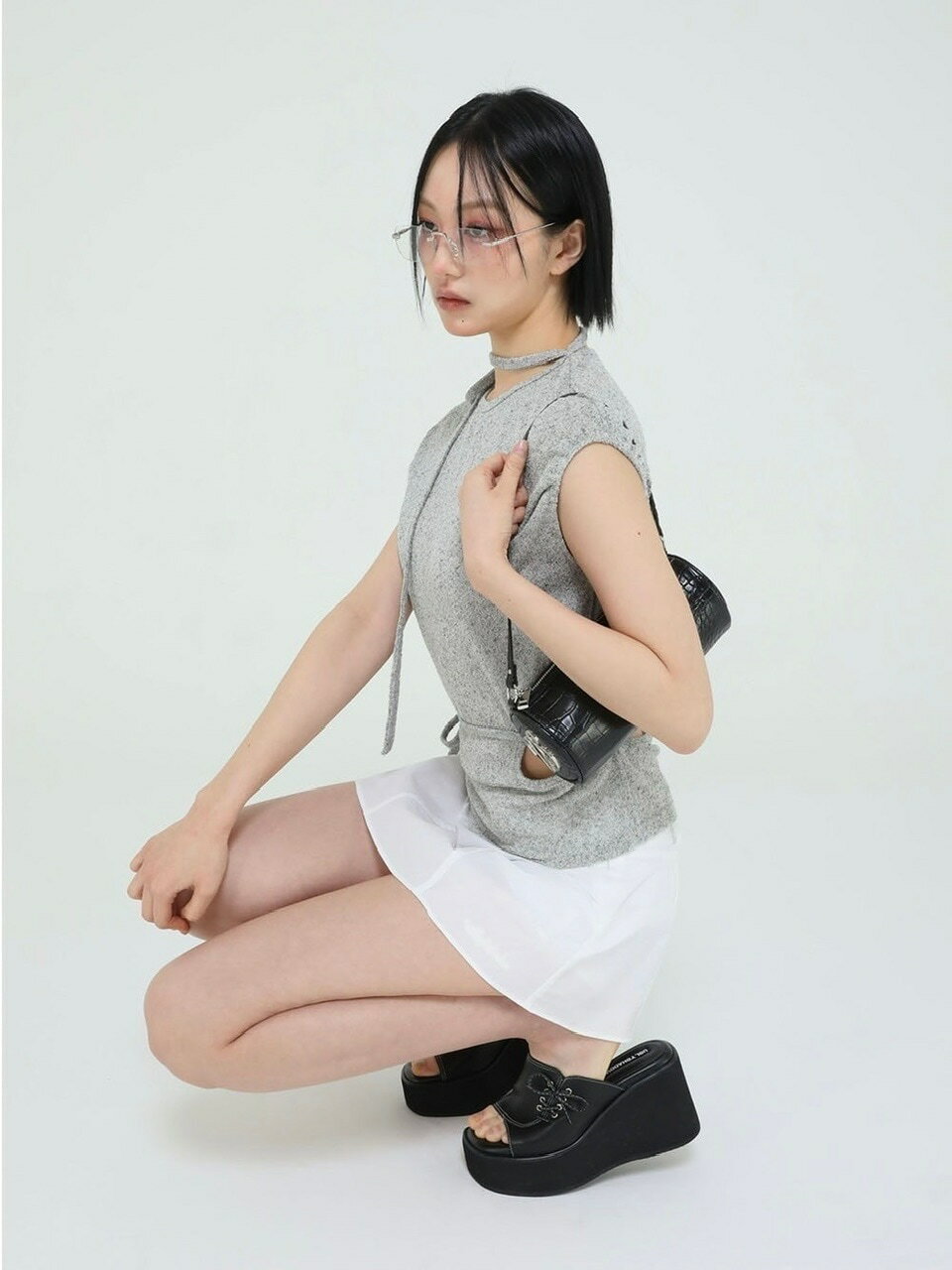 正規品 【Uglyshadow TIE SHIRRING KNITWEAR】ノースリーブ ニット フェミニン ガーリー 韓国ファッション