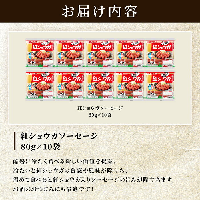 ◆酷暑に冷たく食べる新しい価値を提案。 冷たいと紅ショウガの食感や風味が際立ち、温めて食べると紅ショウガ入りソーセージの旨みが際立ちます。 【お届け内容】 紅ショウガソーセージ 80g×10袋 【発送方法】 冷蔵便 ■加工食品の食品必須記載事項 商品名 紅ショウガソーセージ 名称 リオナソーセージ 原材料名 鶏肉(国産)、生姜酢漬、還元水あめ、豚脂肪、食塩、チーズエキスパウダー、香辛料、ポークエキス、ぶどう糖、魚醤、酵母エキス、かつおエキス/加工デンプン、グリシン、調味料(アミノ酸等)、カゼインNa、酢酸Na、リン酸塩(Na、K)、酸化防止剤(V.C)、酸味料、野菜色素、香辛料抽出物、発色剤(亜硝酸Na)、コチニール色素、アナトー色素、(一部に卵・乳成分・牛肉・鶏肉・豚肉を含む) アレルゲン 卵・乳成分・牛肉・鶏肉・豚肉 内容量 80g 賞味期限 実際の商品、裏面の記載をご覧ください 保存方法 10℃以下で保存してください 製造者 滝沢ハム株式会社 栃木県栃木市泉川町556 販売者 プリマハム株式会社 東京都品川区東大井3-17-4 ご注意 ご自宅向け商品の為、ダンボールでのお届けになります。 のし、包装紙等のギフト対応は出来ませんので、予めご了承ください。 納品書、請求書は同封いたしておりません。 商品の規格・パッケージ等は事前の告知なく変更になる場合がございます。■加工食品の食品必須記載事項 商品名 紅ショウガソーセージ 名称 リオナソーセージ 原材料名 鶏肉(国産)、生姜酢漬、還元水あめ、豚脂肪、食塩、チーズエキスパウダー、香辛料、ポークエキス、ぶどう糖、魚醤、酵母エキス、かつおエキス/加工デンプン、グリシン、調味料(アミノ酸等)、カゼインNa、酢酸Na、リン酸塩(Na、K)、酸化防止剤(V.C)、酸味料、野菜色素、香辛料抽出物、発色剤(亜硝酸Na)、コチニール色素、アナトー色素、(一部に卵・乳成分・牛肉・鶏肉・豚肉を含む) アレルゲン 卵・乳成分・牛肉・鶏肉・豚肉 内容量 80g 賞味期限 実際の商品、裏面の記載をご覧ください 保存方法 10℃以下で保存してください 製造者 滝沢ハム株式会社 栃木県栃木市泉川町556 販売者 プリマハム株式会社 東京都品川区東大井3-17-4
