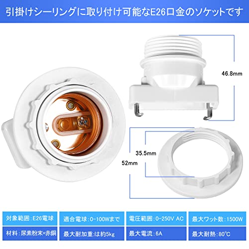 1、引掛けシーリングに取り付け可能なE26口金のソケットです、包装:1個入り、色:白い、サイズ(CM):高さ4.4×幅2.4×全長5.2、材質:尿素粉末+赤銅、本体重量:40g/1個。2、シーリングを設置するほどの広さでないところに、省エネのLED電球やセンサー電球を引掛シーリングに取り付けるのに最適です。3、安全認証:PSE安全規格認証を取得しました。プラグの接合部には高い強度のプラスチック材料を使用して、最大耐加重は約5kg。4、簡単取り付け:天井がスッキリ、取付簡単、邪魔なコードがなく、天井をスッキリさせます。重いシーリングライトより取り付けが簡単になり、交換の手間も減らせます。5、適応場合:キッチン、トイレ、階段、廊下、玄関、洗面所など広さでないところに最適。