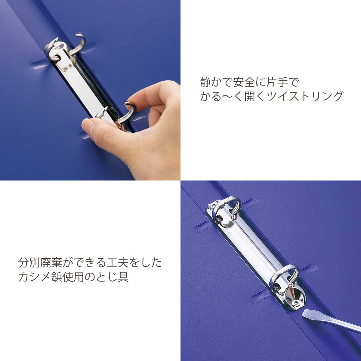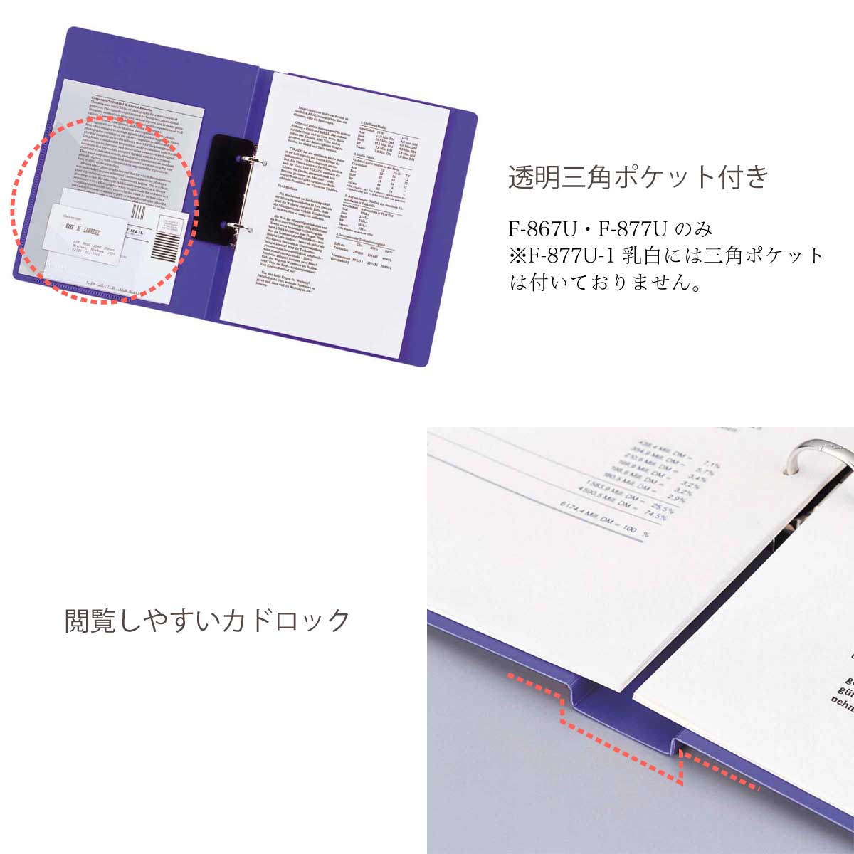 商品名リングファイル カドロック&ツイストリング F-867U ■モニターの都合上、掲載写真と実際の色が異なる場合がございます点ご了承ください。メーカーリヒトラブ(Lihit lab.)仕様サイズ:A4 タイプ:S型 穴数:2穴 幅・奥行・高さ:27mm × 238mm × 306mm収容枚数コピー用紙150枚材質表紙/ポリプロピレン(生地厚1.0mm) とじ具/スチール ◆リング内径:22mm *分別廃棄が出来る工夫をしたカシメ鋲使用のとじ具。カラー乳白 赤 橙 黄 黄緑 緑 青 桃 水 ブルー 黒入数5冊(同色)特長◆片手で軽くひねると開くツイストリング。 ◆書類がフラットになり、背が持ちやすいKADO-LOCK加工。 ◆耐久性に富んだ再生P.P.表紙。ユニバーサルデザイン・リングファイルの新定番◆片手で軽くひねると開くツイストリング。 ◆書類がフラットになり、背が持ちやすいKADO-LOCK加工。 ◆耐久性に富んだ再生P.P.表紙。●軽く開くツイストリング 片手で片方のリングを軽く開くだけで簡単に金具が開くユニバーサルデザイン。 ●分別廃棄できるとじ具 表紙と金具の間にマイナスドライバー等を差し込み、こじるように持ち上げると表紙と金具を分別して廃棄することができます。●閲覧しやすいカドロック(KADO-LOCK加工) 書類がフラットになるユニバーサルデザインのKADO-LOCK加工。 背に手がかかり持ちやすく、書類がフラットになり見やすい構造です。リングファイル カドロック&ツイストリング乳白・赤・橙・黄・黄緑・緑・青・桃・水・ブルー・黒 関連商品はこちら[リヒトラブ] 5冊セット リングファイル...2,400円~2,400円[リヒトラブ] 5冊セット リングファイル...2,000円[リヒトラブ] 5冊セット リングファイル...2,800円[リヒトラブ] 5冊セット リングファイル...2,400円~2,400円[リヒトラブ] 5冊セット リングファイル...2,800円[リヒトラブ] 5冊セット リングファイル...4,900円[リヒトラブ] 5冊セット リングファイル...4,800円[リヒトラブ] 5冊セット リングファイル...2,500円[リヒトラブ] 5冊セット リングファイル...2,350円[リヒトラブ] 5冊セット リングファイル...2,800円~2,800円