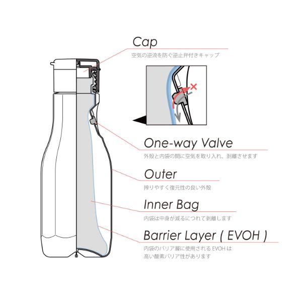 中身と空気の接触を減らし、開封後の鮮度保持力を高めた画期的な二重構造剥離ボトルです。[鮮度保持]内袋がバリア性を持つため、開封後の内容物の長期的な鮮度保持が可能(PET・ビン比較)。[残量低減]内容物の減少と共に内袋が縮むため、残量低減が可能。[耐熱]85℃。[サイズ展開]100、200、360、450ml。醤油や健康オイルなど多数実績あり。※キャップは別売り。サイズ:φ63.2×175.1mm材質:PP多層(最内層PE)重量:23g容量:390ml(満注容量)商品コード00447200メーカー名キョ−ラクサイズφ63.2×175.1mm材質PP多層(最内層PE)重量23.00g容量390ml(満注容量)種別本体のみ対応蓋(別売)HK cap スクリュータイプ ストレートノズル φ4 黒(SNSG4)対応付属品(別売)調味料入れ キャップシール(MHB・ハクリボトル用) キョ-ラク関連商品(ケース)ハクリボトル スクリュータイプ HK-S360 150点・注意事項:モニターの発色によって色が異なって見える場合がございます。・領収書については、楽天お客様マイページから、商品出荷後にお客様自身で印刷して頂きますようお願い申し上げます。・本店では一つの注文に対して、複数の送り先を指定することができません。お手数おかけしますが、注文を分けていただきます様お願い致します。・支払い方法で前払いを指定されて、支払いまで日数が空く場合、商品が廃番もしくは欠品になる恐れがございます。ご了承ください。・注文が重なった場合、発送予定日が遅れる可能性がございます。ご了承ください。・お急ぎの場合はなるべく支払い方法で前払い以外を選択いただきます様お願い致します。支払い時期によっては希望納期に間に合わない場合がございます。