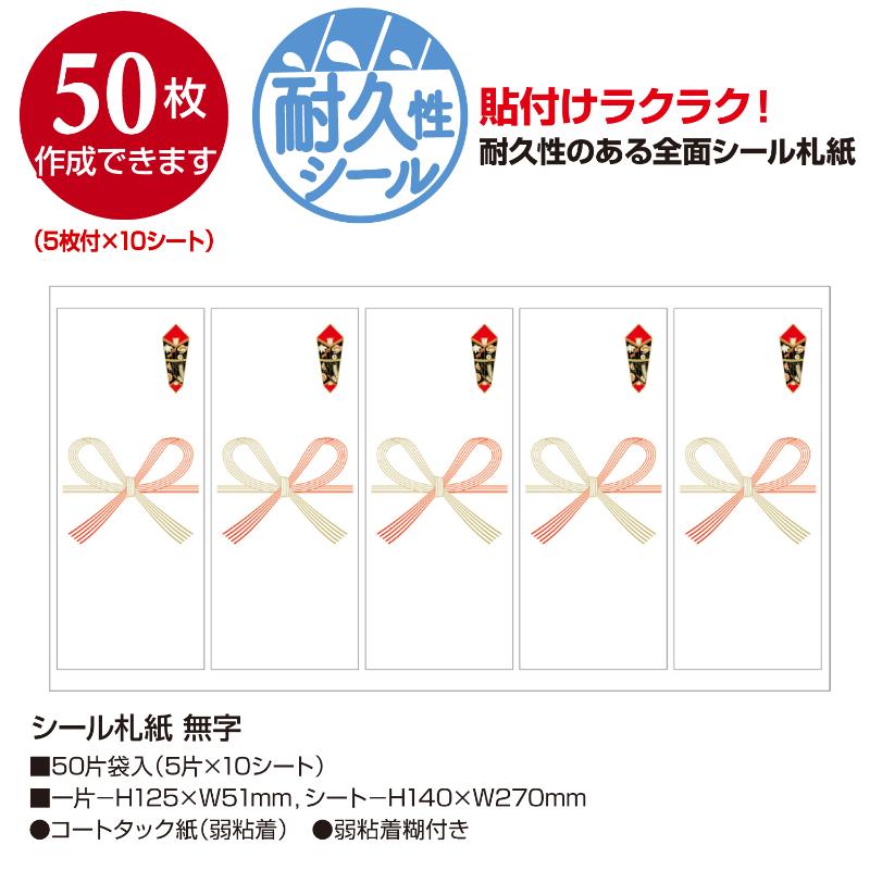 【5組】贈答用飾り 24-1900 シール札紙(短冊のし) 無字 50片入(5片×10シート) ササガワ 00471123