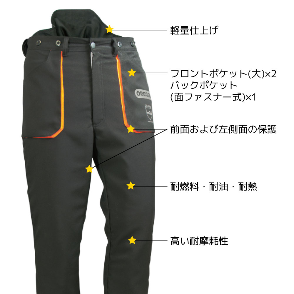 チェンソー作業時は必ず防護衣を着用しましょう! 厚生労働省より労働安全衛生規則の一部を改正する省令が公布され、2019年8月1日より、事業者・労働者に対する下肢用防護服の着用が義務化されます。 これは林業事業者に限らず、造園業・建設土木でチェンソー防護ズボン及びチェンソーチャップスの着用が義務化となります。 今回の義務化対象は「伐木等作業する事業者・労働者」ですが、当店ではチェンソーを扱う全ての方に防護ズボンやチャップス以外の防護用品の着用を推奨します。 Q.何を買えばいいの? A.以下の規格に「適合」または準拠しているものであれば、今回の義務化に適用されます。 ・JIS T 8125(日本工業規格) ・ISO 11393(国際標準化規格) ・EN 381-5(欧州規格) ・ASTM F1897(米国規格) 当店で販売しておりますOREGONブランドの防護ズボン、チャップスはすべて義務化に適用しております! ※注意:防護服は切創を最小限に抑えるものであり、切創事故を確実に防ぐものではありません。 商品詳細 特徴 万一のとき、防護材がチェーンにからみつき、チェンソーの動きを停止。 事故から作業者を守ります。 軽量で快適、耐摩耗性に優れた防護ズボンは、チェンソーユーザー、造園業者など、屋外での過酷な作業に適しています。 2wayストレッチポリエステル素材。 オイルやガソリン、熱によるダメージを防止しながら、通気性にも優れ、日中でも涼しさを保ちます。 大きなポケットが前に2つ、後ろに1つ(ベルクロ付き) KWF規格を取得。 保護素材を採用し前面・横に防護機能 柔らかな着心地です。 メーカー OREGON(オレゴン) 品名 防護ズボン 295435 軽量ユーコン クラス1 36005L サイズ L ウエスト 88~92cm ヒップ 約110cm 股下 82cm 重量 約1.0kg 備考 安全規格:EN 381-5(欧州規格) クラス1チェーンスピード20m/s ▼防護ズボンにぴったりなサスペンダーはこちら ボタン式 クリップ式