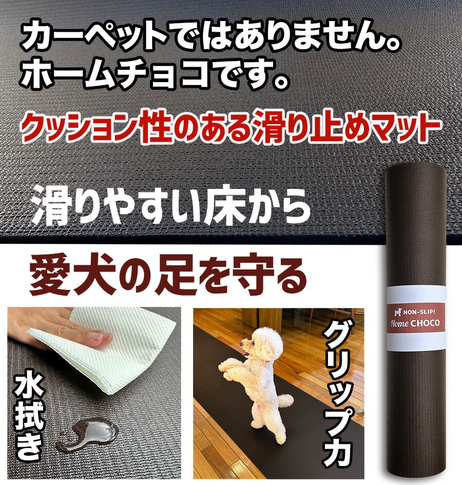 大切な愛犬を危険な滑る床から守る。愛犬専用滑り止めマットHOME CHOCO。 高齢犬の立ち上がりや歩行をサポート。仔犬や成犬が足の関節を傷めないように。食事の時は足も食器も安定。 材質は高密度PVCフォーム。クッション性のある厚み4mmのマットです。表面は自然な風合いの滑り止めシボ模様で愛犬の足をしっかり支えます。 よくある繊維のカーペットでは無いので水は染み込みません。フローリングのように拭き掃除できます。 冬の冷たい床に対しては断熱効果。ワンちゃんの足音には防音効果。 色はどんなお部屋にも似合うシックなチョコレートブラウンです。HOME CHOCO、愛犬と暮らすお家に欠かせないアイテムです。 【ホームチョコはVer.IIIに進化しました】 ●厚さ4mmのクッション性のある高密度フォーム。関節にやさしく愛犬をしっかり支えます。 ●表面の滑り止めは自然な風合いのシボ模様。肉球、爪でしっかりグリップできます。 ●水は染み込みません。フローリングのように拭き掃除できます。 ●横幅は70cmに広がりました。廊下をしっかりカバーできます。 ●裏面はコインドットパターン。床への密着性が高いです。 ●高密度フォームなので70cm×1mあたりの重さは約1.1kg。重くなり安定性が増しました。 【サイズバリエーション】 | 70cm×長さ指定 | 70cm×1m | | 70cm×2m | 70cm×3m | | 70cm×4m | 70cm×5m | | 70cm×6,7,8,9m | 70cm×10m | | 150cm×2m | 150cm×3m | | 150cm×4m | 150cm×5m | | 150cm×6m | 150cm×10m | 室内用 愛犬のための滑り止めマット HOME CHOCO III (ホームチョコVer.III) ●サイズ: 幅70cm×長さ3m(約3.3kg) ●材質:高密度PVCフォーム(表裏一体・クッション性のある厚み4mm) ●色:チョコレートブラウン(写真の色合いはお使いのPC・スマホにより異なります) 【長さを指定した注文もできます】 10cm単位で最長10mまでの長さを指定できるオーダーのページもあります。複数枚の同時注文も可能です。 → こちらをクリック [stad90300]大切な愛犬を危険な滑る床から守る。愛犬専用滑り止めマットHOME CHOCO。 高齢犬の立ち上がりや歩行をサポート。仔犬や成犬が足の関節を傷めないように。食事の時は足も食器も安定。 材質は高密度PVCフォーム。クッション性のある厚み4mmのマットです。表面は自然な風合いの滑り止めシボ模様で愛犬の足をしっかり支えます。 よくある繊維のカーペットでは無いので水は染み込みません。フローリングのように拭き掃除できます。 冬の冷たい床に対しては断熱効果。ワンちゃんの足音には防音効果。 色はどんなお部屋にも似合うシックなチョコレートブラウンです。HOME CHOCO、愛犬と暮らすお家に欠かせないアイテムです。 【ホームチョコはVer.IIIに進化しました】 ●厚さ4mmのクッション性のある高密度フォーム。関節にやさしく愛犬をしっかり支えます。 ●表面の滑り止めは自然な風合いのシボ模様。肉球、爪でしっかりグリップできます。食器も滑りません。 ●水は染み込みません。フローリングのように拭き掃除できます。 ●横幅は70cmに広がりました。廊下をしっかりカバーできます。 ●裏面はコインドットパターン。床への密着性が高いです。 ●高密度フォームなので70cm×1mあたりの重さは約1.1kg。重くなり安定性が増しました。 【サイズバリエーション】 | 70cm×長さ指定 | 70cm×1m | | 70cm×2m | 70cm×3m | | 70cm×4m | 70cm×5m | | 70cm×6,7,8,9m | 70cm×10m | | 150cm×2m | 150cm×3m | | 150cm×4m | 150cm×5m | | 150cm×6m | 150cm×10m | 当ページの商品: 室内用 愛犬のための滑り止めマット HOME CHOCO III (ホームチョコVer.III) ●サイズ: 幅70cm×長さ3m(約3.3kg) ●材質:高密度PVCフォーム(表裏一体・クッション性のある厚み4mm) ●色:チョコレートブラウン(写真の色合いはお使いのPC・スマホにより異なります) 【長さを指定した注文もできます】 10cm単位で最長10mまでの長さを指定できるオーダーのページもあります。複数枚の同時注文も可能です。 → こちらをクリック