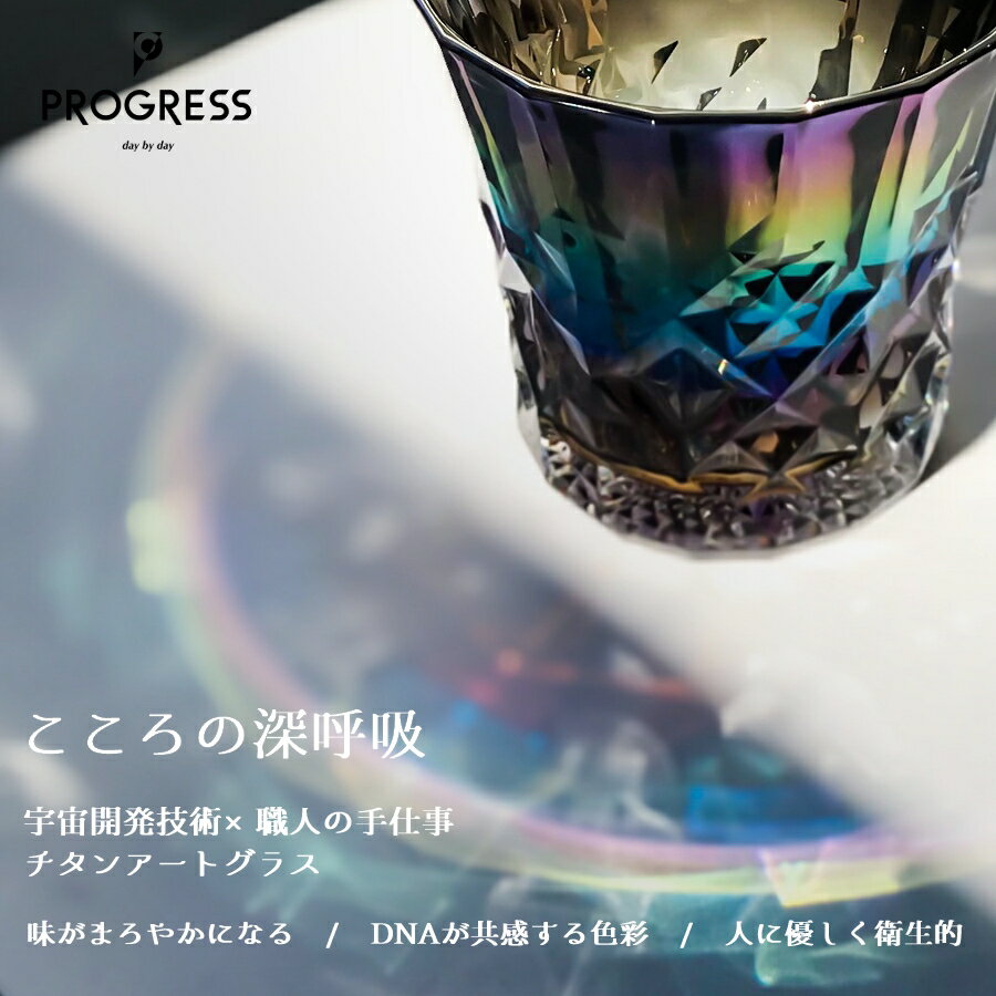 重厚なカットデザインが施されたロックグラス。 光の表情が際立ちインテリアにもなる存在感。 Infinite:安らかで心地よい神秘的なオーロラカラー ・モニターの発色によって、実際のものと色が異なる場合がございます。 ・製品には、色味、風合いなど個体差があります。チタン独特の経年変化を末永くお楽しみください。 ・グラスの色は、光の反射と屈折にて彩られていますので、照明や日光など光量や当たる角度により変化します。 -concept- 人生の主役を讃える 世界中には、たくさんの素敵な物語が溢れています。そして、その物語の主人公は、まぎれもなくあなた自身です。生まれたその日から、物語が始まり、重なり、いまなお続いています。 人には、ひとりひとりの物語があり、そこには幾多の喜怒哀楽があるはずです。「あなた自身が主役の物語に自信を持って過ごして欲しい」と願いを込めたデザイン。 商品情報 サイズ Φ90×H90mm 270g 容量 265ml 材質 ガラス/チタン カラー Infinite 仕様 1個 / 化粧箱入り 刻印 側面・底面 付属品 取扱説明書 / 90日間保証書 食洗機 使用不可 電子レンジ 使用不可 オーブン 使用不可 ■01/味がまろやかになる 純チタンは、ステンレスやアルミなど他の金属カップのように金属イオンが 流出して、金属臭による飲み物の味を変えてしまうことはありません。 繊細に味の本質を感じ取っていただけます。 それだけでなく、グラス内面に施された純チタンの活性酸素作用により 雑味を分解し「味がよりまろやかになる」と言われています。 ■02/DNAが共感するここちよさ 古来より大自然の壮大な芸術と語られ、人のこころを癒してきたオーロラを 最先端テクノロジーにより再現しました。 その光のアートは、人が潜在的に心地よいと感じる小川のせせらぎや焚火の炎、波の音などと同じ1/fゆらぎを持っています。 グラスの中で注いだ飲み物の色が反射しゆらめくことも同じです。 いつの間にか時間を忘れ心地よい穏やかさに吸い込まれていく、自分らしくありのままでいられる心地よい時間を演出します。 ■03/人に優しく衛生面でも安心 プラチナや金よりも身体親和性が高く「人に最も優しく安心」な希少な純チタン。 その安全性の高さでは他金属に比類がないとされており、人工衛星や装飾品にも 使われるほど注目を集めています。 経年変化もほとんどありません。 そして、においや汚れが付きにくく医療分野でも活用されるほど衛生面でも とても優れています。 【名入れ刻印・透輝彫り】 チタンミラーに刻まれた文字や模様が透き通り、 光り輝く「透輝彫り」はPROGRESS独自の技法です。 飲み物を注ぐと、飲み物の色や質感を映し出され、一杯ごとに異なる視覚的な体験を提供し、 その瞬間の特別感を引き立てます。 1.刻印箇所を選ぶ 2.刻印デザイン(フレーム)を選ぶ 3.フォントを選ぶ 4.刻印内容を入力する 最大行数3段。一行最大文字数10文字。 ※イニシャルは1文字のみ刻印できます。 (エンブレム/月桂冠/アンティーク) ※スペースは1文字となります。全て中央揃えとなります。 ※PROGRESS公式ロゴは、ロゴが刻印される為、印字はできません。 ※文字数により文字の大きさが小さくなることがあります。 ※ゴールド文字部分が印字可能箇所となります。白色部分のフォントは変更できません。 ※刻印の納期は、2〜7日程度(デザイン、数量による) 【ギフトシーン】 誕生日/還暦祝い/内祝い/結婚祝い/母の日/父の日/敬老の日/クリスマス/バレンタイン/ホワイトデー/新築祝い/引っ越し祝い/退職・異動のお祝い/記念品/ノベルティ 大量数のご注文を希望の方はお問合せください。 【注意事項】 ・モニターの発色によって、実際のものと色が異なる場合がございます。 ・製品には、色味、風合いなど個体差があります。チタン独特の経年変化を末永くお楽しみください。 ・グラスの色は、光の反射と屈折にて彩られていますので、照明や日光など光量や当たる角度により変化します。