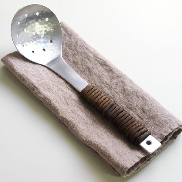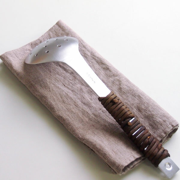 サイズ(目安) 全長 25.2cm (すくう部分 W 8.0×H 7.3cm) 重量(目安) 63g 材質 アルミニューム、アケビ蔓 使用区分 食洗機 × 原産国 日本 ■ご確認ください ●金たわしや研磨剤で磨くと表面にキズがつきますのでお勧めできません。 ●ご使用後は中性洗剤とスポンジで良く洗い、十分に水気を拭いてください。 ●アルミは白いサビがでる場合がありますが、人体に無害な成分ですのでご安心ください。 ※ラッピングをご希望の方はこちらをご覧ください。工房アイザワ アケビ巻き お玉 穴あけ 中 卓上お玉よりも大きいサイズで、鍋料理などの取り分け用にオススメのサイズです。穴あきタイプは適度に汁を切る事ができるので、すき焼きやおでんなどに重宝しますよ。通常タイプとセットでご用意されておくと便利だと思います。アケビのツルを巻きつけたものは持ち手部分が熱くならず、滑りにくいのがポイントでしかもオシャレ。愛用しているうちにアケビに艶が出てきそうですよね。(洗った後はすぐに水気を拭取るようにしてくださいね!)お玉の部分はアルミの素材を叩きながら成型をする槌目(つちめ)打ちという技法で仕上げられています。軽くて扱いやすいお玉です!
