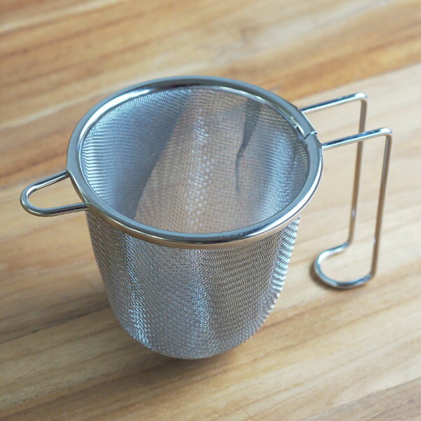 サイズ(目安) φ7.5×H7.0cm(持ち手含む最大幅11.5cm) 重量(目安) 46g 材質 ステンレス 使用区分 食洗機 ○ 原産国 日本 ※ラッピングをご希望の方はこちらをご覧ください。工房アイザワ 深型茶こし 大 ひとり分のお茶を美味しく淹れられる深型の茶漉し。 この大きく深さのある形は茶葉の対流を妨げず しっかり膨らませて抽出することができるので、 ポットで淹れたような美味しいお茶を楽しむことができます。 茶漉しは外網と内網の二枚網で仕上げられており、 内側はより細かなメッシュ仕上げに。 細かな茶葉も流出せず、目詰まりしづらいから 使い終わった後もさっと水洗いするだけで簡単に洗い流すことができます。 持ちやすい大きな持ち手はカップに入れた時の安定感はもちろん、 取り出した後は小皿にのせておけば倒れたりしませんし、 洗ったあとはハンドルを下にして水切りをすることも。 2サイズご用意いたしましたので、ご愛用のカップに合わせてお選びください。