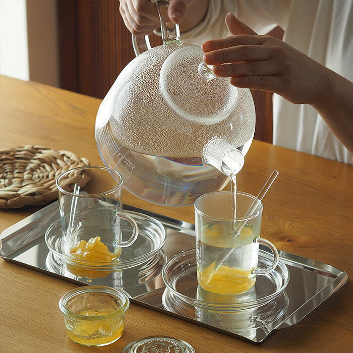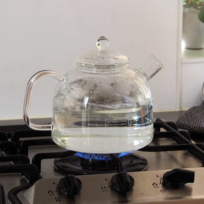 サイズ(目安) W22(取っ手含む)×D16.4×H17cm 容量(目安) 1.75L 重量(目安) 510g 材質 ホウケイ酸ガラス 使用区分 直火○(空焚きはしないでください)、電子レンジ ○(本体のみ)、食洗機 ○、オーブン ×、IH × 原産国 ドイツ製製 ■ご確認ください ●空焚きはしないでください。 ●急激な温度変化で割れることがございます。本体が熱くなっている時は、冷たいものを入れたり、濡れた場所に置かないでください。 ●洗浄の際は、研磨剤入りたわし、金属たわしやクレンザーなどを使用しないでください。 ●ストーブの上では使用しないでください。 ●満水近くまで水を入れて沸かすと熱湯が噴き出すことがあるためご注意ください。 ●冷蔵庫での使用は避けてください。 ●ご使用の前に同梱している取扱説明書をよくお読みのうえ、正しく使用してください。 ※ラッピングをご希望の方はこちらをご覧ください。トレンドグラス イエナ クラシック 1.75G / Trendglas Jena お湯が沸いている様子も可愛い ドイツ製製のガラスのケトル 丸く膨らんだ泡がぽこぽこと音を立てながら、 膨らんでは弾けていく様子に時間を忘れて見惚れてしまう… お湯を沸かす時間を五感で楽しめるガラス製のケトルをご紹介いたします。 ハンドル、フタ、注ぎ口、全てが耐熱ガラスで作られ見た目の美しさも堪能できる、 直火対応のガラスのケトル。 1920年代、ドイツ製製で耐熱ガラスの代名詞的存在であった イエナガラスの伝統をそのまま受け継いだ、 トレンドグラス イエナ(Trendglas-Jena)のもので、 現在もドイツ製製とハンガリーでクオリティを保ちながら生産され続けています。 ガラス製ということで扱いに不安を持たれる方もいらっしゃるかもしれませんが、 いつもお使いのケトルと同じようにお使いいただくことができます。 さらにガラスの特性として直火だけでなく、電子レンジ、 食器洗い機の使用も可能な日常使いに適した機能性が備わっているのもプラスのポイント。 体を整えるコップ一杯の白湯、くつろぎのティータイム、食後のお茶、 ガラスのケトルでお湯を沸かすだけなのに、 なぜだか特別な時間を過ごしているような気持ちになるから不思議。 特に日が暮れた後、薄暗いキッチンで使うと青い炎と お湯が溶け合う様子が幻想的で目が離せなくなります。 約1.75Lのお湯が沸かせるたっぷりサイズ。 家族みんなで飲むお茶を淹れるときも、 一人分のコーヒー用に少しだけ沸かしたいときにも、 フットワーク良く対応できます。 沸騰直後は全体的に熱を帯びるため、ミトンやクロスを使用してハンドルを握ると安心。 大きめのハンドルはミトンをつけた状態でもしっかり握れ、注ぎやすい。 手の大きな男性でもきっと扱いやすいと思います。 フタはというと、引っ掛かりがないシンプルなつくりのため、 手を添えながら注ぐようにしてください。 太く短めの注ぎ口には小さなくぼみがついています。 このくぼみを伝ってお湯がスーッと流れ、 ケトルを戻したときのお湯切れもすこぶる気持ちがいいのです。 心をくすぐるデザイン 本体側面にはケトルのイラストと英語と(反対側はドイツ製製語)のテキストが 可愛らしくデザインされています。 こちらは使用に関する注意書きを記しているものなのですが、 透け感のあるガラスに書かれているため目立ちすぎず、 でも紅茶などを淹れたときはくっきりと浮き立ち、 ちょっとしたユーモアにも心を踊らされます。 お茶が綺麗に見えるガラスのティーポット 中の様子がひと目でわかるガラスのケトル。 もうひとつの嬉しい使い方がティーポットです。 ダイレクトに茶葉を入れて火にかけると、ケトルの中でゆったりと ジャンピングする茶葉から目が離せなくなるほど愉快で、 しばらくはコンロの前が定位置となりそうです。 (茶漉し付きではないため、カップに注ぐときはお手持ちの茶漉しをご用意ください) 茶葉は手間がかかる、そんな方はティーバッグでお茶を淹れても優雅なひと時を過ごせます。 実際に使用したスタッフによると、紅茶を淹れると広めの注ぎ口から ふわ〜っといい香りが部屋いっぱいに広がり幸せな気持ちになったそう。 ガラス越しに茶葉が開く様子や特有の色合いを目でも堪能できる ハーブティーや薬膳茶や台湾茶。 カラフェのようにフルーツティーを淹れるポットとしても新鮮です。 長くお使いいただくために まずはガラス製品のメリットから。 ガラス製品はニオイがつきにくいのが特徴です。 そのため、お湯を沸かすだけでなく、 好みのお茶をその日の気分に合わせて楽しむことができます。 そして、茶渋などの汚れがついた場合は漂白剤を使用して汚れを落とすことが可能です。 あまりないかもしれませんが、水垢がついてしまった場合は お酢や水に溶かしたクエン酸などで落とすことができますよ。 余計な凹凸がないので、隅々まできれいサッパリ洗え、 毎日清々しい気持ちで手に取れます。 デメリットとしては急激な温度変化に弱いこと。 ま