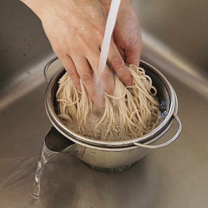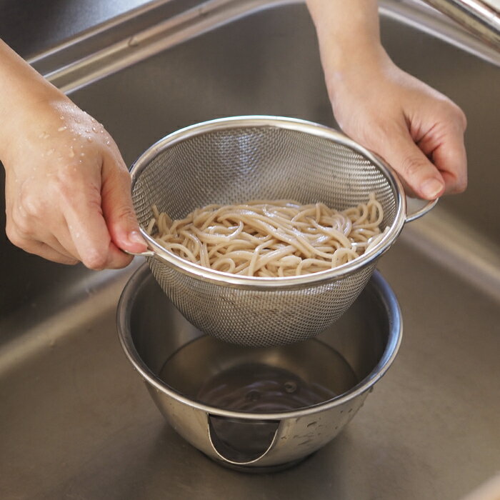サイズ(目安) W20.5(ザルの持ち手含む)×D16.5×H9.5cm ボウル内径:14.8cm(ボウル底面に15と表示があります) 重量(目安) ザル:140g、ボウル:150g 容量(目安) 満水850ml、適正680ml 材質 18-8ステンレス(14メッシュ)(ヘアライン仕上げ) 使用区分 電子レンジ ×、食洗機 ○、オーブン × 原産国 日本 ■ご確認ください ●ご使用の前に同梱している取扱説明書をよくお読みのうえ、正しく使用してください。 ●小さな傷や跡、黒ずみ、ムラ、凹凸が見られる場合があります。また接合部分に凹凸や着色などが見られる場合があります。製造工程のものですので、ご了承ください。 ※ラッピングをご希望の方はこちらをご覧ください。家事問屋 横口ボウルザルセット 15 1〜2人分の下ごしらえに便利なコンパクトサイズ 清潔で機能的。これが家事問屋の台所道具。 常に衛生的に扱える丈夫なステンレス製で 余計な装飾を持たせない端正なデザインが好印象。 それぞれの用途が明確なため使いにくさが全くなく、 使い手目線にこだわった機能性は快適そのものです。 金属加工の産地、燕三条の地に根差す職人さんが生みだす、 働きもので長く付き合える頼もしい道具たちが 日々の台所仕事を楽しい時間に導きます。 当店スタッフの愛用者も多い人気の横口ボウルザルセットに 小さめサイズの「横口ボウルザルセット15サイズ」が仲間入り。 このサイズを待ちわびていた方も多いのではないでしょうか。 ボウルとザルがセットになったこの商品、 とにかく使ってみるとその便利さに驚きます。 ボウルとザルはすっきり収まり、 ザルには取っ手が付いているから持ち上げて水を切る動作も簡単。 ザルをセットした状態で茹でた麺を洗う時も 水が溢れて流れ出すことがないから 心おきなくぬめりを取ることができちゃいます。 小回りの効く15サイズでお米を研ぐ場合の適量は1〜2合。 麺類も1〜2人分がちょうど良いです。 他にも豆腐の水切り、野菜の洗浄、 冷凍しておいた食品を流水で 解凍したい時などにも使いやすいサイズ。 注ぐ口が付いたボウルはたこ焼きやホットケーキなどの 生地を器具に流し入れやすく、 だし巻き卵を作る時も大きすぎて持て余す… なんてことがありません。 一人暮らしの方やキッチンが狭い方にも 快適にお使いいただけるサイズです。使い終わったら食洗機で丸洗いが可能。 ザルの底には汚れがたまりやすいワイヤーなどがないため 手洗いでもさっと汚れを取り除くことができ、 ボウルは艶を抑えたヘアライン仕上げのため 傷が目立ちにくいのもポイントです。 シンプルなデザインと丈夫で機能性に優れた 「横口ボウルザルセット15サイズ」は、 新生活をスタートする方やご結婚祝いなどの ギフト商品としてもおすすめです。