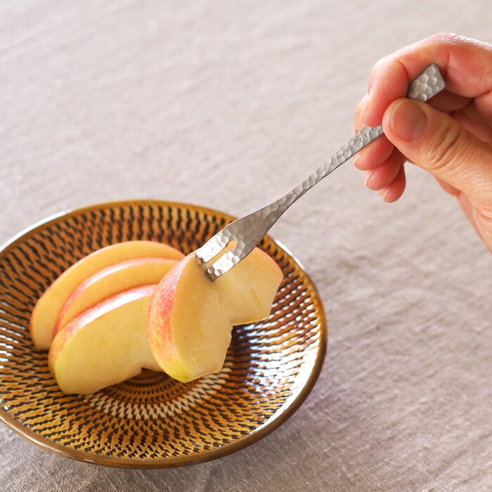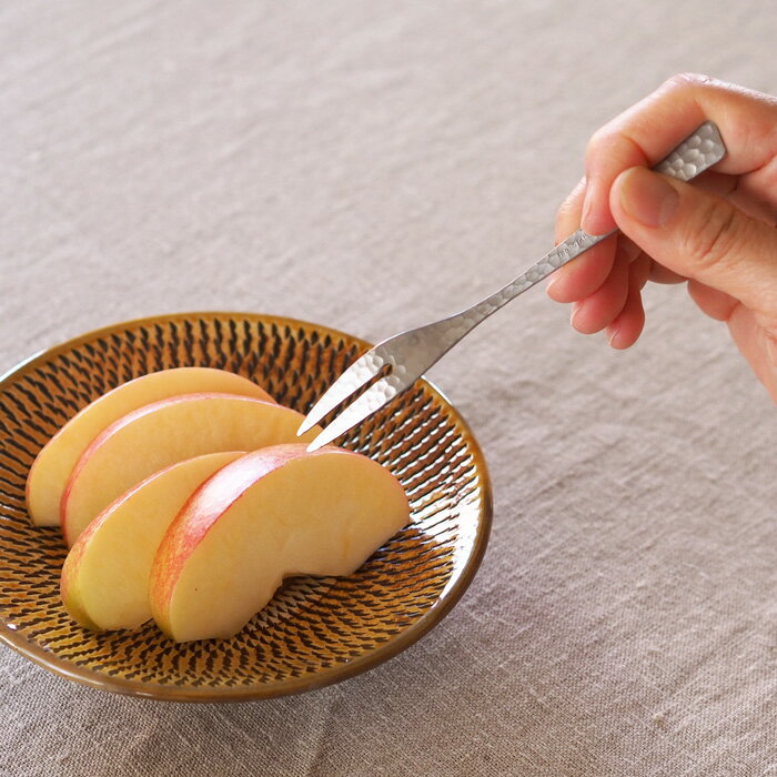 サイズ(目安) 13.2cm 重さ 12g 材質 18-0ステンレス 使用区分 食洗機 ○ 原産国 日本 対応ギフトボックス Mサイズ ■ご確認ください ●小さな傷や跡、黒ずみ、ムラ、凹凸が見られる場合があります。製造工程のものですので、ご了承ください。 ●一点毎に仕上がりのサイズ・重さなど、異なることがございます。 ●塩分や酸等を含んだ汚れを付着させたまま放置したり、湿気の多い場所での保管はさびの原因となります。 ●ご覧になる環境(PCのモニタやスマホの画面)などにより、色合いが異なって見える場合があります。 写真と実物では色が若干異なる場合がございますのでご了承ください。 ※ラッピングをご希望の方はこちらをご覧ください。草土 WASABI ピックフォーク / SOHDO 槌目の和テイストが 趣あるカトラリー 端正なシルエットに表情のある槌目加工を施した 草土・WASABIシリーズ。 槌目模様というと錫や銀のカトラリーを 想像する方もいらっしゃると思いますが、 こちら実は馴染みのあるステンレス製。 新潟燕市で製造されているWASABIシリーズは、 一つ一つ職人が手打ちで仕上げる槌目を金型によって プレス成形し、ステンレスに手仕事を感じさせる 温もりをまとわせた美しい品のある風合いに仕上げています。槌目の加工と落ち着いた輝きを放つ セミマットによって傷が目立ちにく、 水垢や指紋が目立たないのも普段使いに嬉しいところ。 また、槌目のポコポコとした凹凸により手馴染みが良く、 絶妙なフィット感があるため 使っているときのストレスがありません。 全体的に薄手で軽い使い心地ですので、 手の小さな方やお子さんにも使いやすく ゆったりとした食事の時間に優しく寄り添います。 お気に入りのカトラリーで 食事の時間を豊かにして欲しいとの思いから、 ラインアップも幅広くセレクトしました。 全体的に緩いカーブを描き、 持ち手から先端部分に向かうくびれの部分を キュッと絞った個性的なデザインのヒメフォーク。 りんごや梨を食べるときの フルーツフォークとして使いやすいサイズです。 他にも小さめの和菓子や焼き菓子を食べるときにも、 このヒメフォークを使えば 自然と所作が美しくなりそうです。 おもてなしの席に登場させてもきちんと感を 添えてくれるため、数本揃えておくと重宝します。いつもの料理、いつもの食器と 気軽に合わせてお使いいただけますが、 和のテイストを楽しむカトラリーとして 和食や和菓子、和食器との相性は文句なし。 箸と並べても馴染むカトラリーですので、 日本の食卓にぴったりです。 また、食器のテイストとしては 作家さんの器と相性が良く、 木のお盆に器とWASABIのカトラリーをのせると 雰囲気がぐっと高まります。 カトラリーが変わるだけで お店で食事を楽しんでいるような気分を 楽しめるなんて嬉しい限り。使い終わったら食洗機での洗浄が可能です。 手洗いの際も普段通り、 スポンジに中性洗剤をつけて 洗っていただければ大丈夫です。 目の引くデザインながら飽きがこないため、 今までとは雰囲気の違ったカトラリーを使ってみたい、 そんな方にもおすすめです。 このシリーズは外国の方にも人気とのこと。 ギフトにもぜひお選びください。