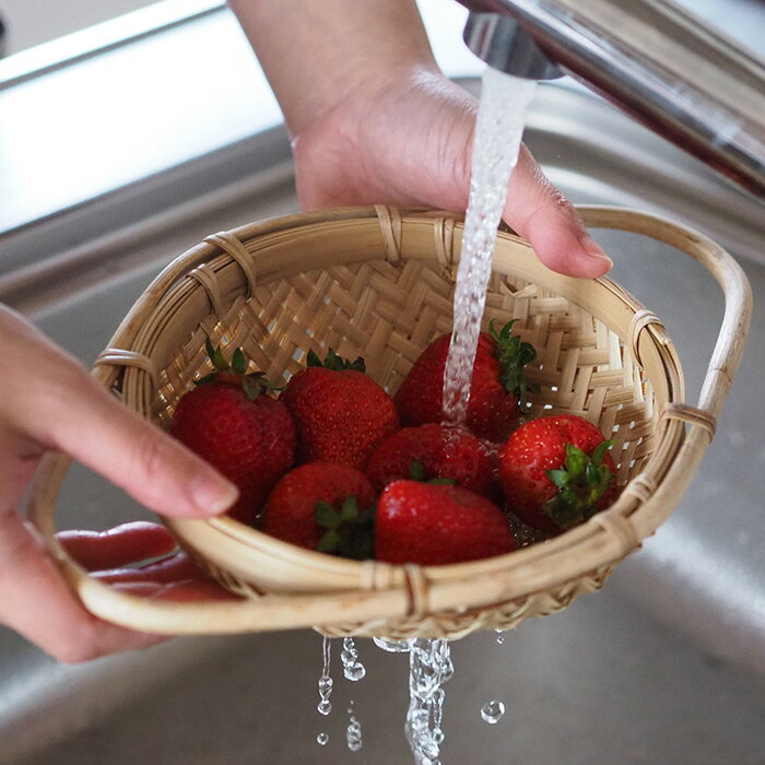 サイズ(目安) 大:φ20(持ち手含む30cm)×H8cm 小:φ15(持ち手含む23.8cm)×H6.5cm 重さ(目安) 大:86g 小:51g 材質 竹、籐 使用区分 電子レンジ ×、食洗機 ×、オーブン × 原産国 バングラデシュ ■ご確認ください ●自然素材を使用した手編みのため、色の違いや、仕上がりのサイズ・形など、異なることがございます。 ●製品の特性上黒ずみ、ささくれ、とげなどがみられる場合がございます。予めご了承ください。 ●ご購入後、はじめてご使用になる前に水に濡らすと、余分な汚れが取れ、においなどがつきにくくなります。 ●普段のお手入れは、水ぶきなど、洗剤はなるべく使わないことをおすすめします。(自然の素材で洗剤の香りを吸収しやすいため) ●肉や魚を乗せた場合は、そのにおいもつきやすいので、気になるときは洗剤でさっと洗ってください。(肉・魚専用など、使い分けをおすすめします。) ●洗った後は風通しの良いところでかげ干ししてください。 ●お使いのPC・携帯等端末の環境により、実際の製品と画像の色味が若干異なる場合がございます。予めご了承ください。 ※ラッピングをご希望の方はこちらをご覧ください。ピープルツリー ハンドルつき竹ザル 2個セット / People Tree 使う楽しみが広がる手編みの竹ザルセット フェアトレード専門ブランド・ピープルツリーから 使う楽しみが広がる竹製のざるが届きました。 こちらはバングラデシュでひとつひとつ手編みで作られている 両手ハンドル付きの竹ザル(2個セット)です。 大サイズの直径は約20cm、 小サイズの直径は約15cm(両サイズ共ハンドル含まず)。 どちらも深さのある作りで、 ハンドル部分には籐を使用しています。使い方は色々。自由な発想でお使いいただけます。 水切りざるとして使う場合は大きなハンドルを ボウルなどにかけて使うこともできるため、 安定感のある使い心地。 他にはりんごやみかん、玉ねぎやじゃがいもなどを 入れておいたり、お庭でハーブを育てている方は 摘んだハーブを入れても素敵。 見た目が可愛いから、 器のように使うのもおすすめの使い方です。 朝食用のパン、おやつのクッキー、 食後のデザートのいちごやさくらんぼ、おつまみの枝豆。 お蕎麦などを入れて食卓に出すこともできますが、 不安定さが気になる場合は底面を支えられる サイズのお皿の上において使うとゆらゆらしにくくなると思います。 陶器やガラスの器とも趣が異なる 竹のざるが食卓に並ぶだけで風景がガラリと変わりますよ。 使い終わったらできるだけ早く乾燥させておくことが カビから守るために大切なこと。 このざるはハンドル部分をフックにかけて吊るしておけるので、 乾かしながら見せる収納を楽しむことができます。 天然素材を使用しているため、 若干のささくれや黒ずみが見られる場合がございます。 また色合いやサイズなどにも個体差がございますことを 予めご了承の上ご購入くださいますようお願いいたします。 使うたびに少しずつ竹の色合いが変化する経年変化も ぜひお楽しみください。