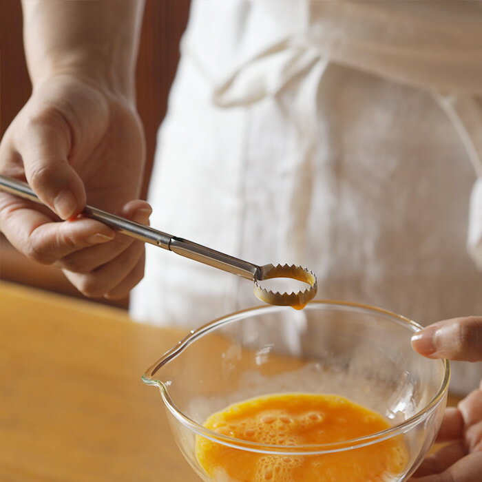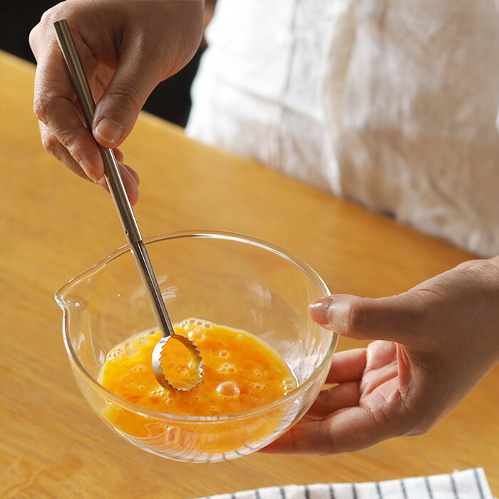 サイズ(目安) L18×W2.5×D0.7cm 重量(目安) 18g 材質 18-8ステンレス 使用区分 食洗機 × 原産国 日本 ■ご確認ください ●ご使用の前に同梱している取扱説明書をよくお読みのうえ、正しく使用してください。 ●小さな傷や跡、黒ずみ、ムラ、凹凸が見られる場合があります。製造工程のものですので、ご了承ください。 ●ステンレスは耐蝕性に優れた金属ですが、ご使用の状況によってはサビが発生することがあります。サビを防ぐために以下の点に注意してください。 ・塩分や油脂分を含んだ汚れが付いたまま放置したり湿気の多い場所で保管しない。 ・鉄やアルミ等の異種金属と接触したまま放置しない。 ●お使いのPC・携帯等端末の環境により、実際の製品と画像の色味が若干異なる場合がございます。予めご了承ください。 ※ラッピングをご希望の方はこちらをご覧ください。EAトCO トク/たまごとき 均一な溶き卵が あっという間に完成 モノづくりの街として有名な新潟県燕三条の技術を ふんだんに取り入れたキッチンツールブランド 「イイトコ (EAトCO)」。 イイトコは「EAT + COOKING」を組み合わせたオリジナルの造語で、 まさに食べること、料理を作ることが好きな人のための道具が揃います。 日々、台所に立つたびに感じていた小さなストレスを解消するだけでなく、 楽しみながら作業ができるこだわりがぎゅっと詰まっています。卵を滑らかになるまで溶くのは意外と時間がかかるもの。 しかし、「トク/たまごとき」を使えば 短時間で滑らかな卵液を作ることができます。 先端のリング状の部分には端にギザギザの刃が付いていて、 混ぜるときに卵白を細かく切るように混ぜることができ、 ギザ刃部分にはカラザを取り除く役割もあります。 箸で混ぜると白身を切るために箸をすくい上げたり、 カラザを取るのにモタモタしたりしますが、 このスティックを使うと何十回か混ぜるだけで滑らかに混ざります。 だし巻き卵、茶碗蒸し、プリンなど しっかり卵黄と卵白と混ぜて 均一にしないと見た目が美しくならない料理には 不可欠な道具だと言えるでしょう。 また、どろっとした卵白が苦手な方にも 試したいただきたい道具です。 場所を取らないからツール立てにスマートに収納でき、 使い終わったら流水でさっと洗い流すだけでOK。 安心の日本製です。
