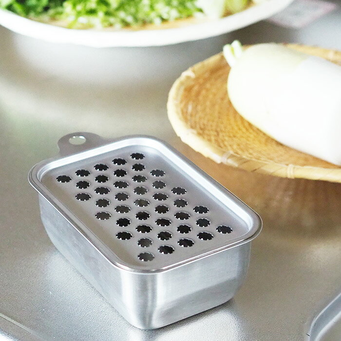 サイズ(目安) 10.7×18.1×0.6cm 重量(目安) 93g 材質 18-8ステンレス 使用区分 電子レンジ ×、食洗機 ○ 原産国 日本 ■ご購入前にご確認ください ●製造時に機械や金型と触れたり研磨したりすることで発生する細かなキズや凹凸、ステンレスを曲げる際についた筋、溶接による凹凸などがみられる場合がございます。製造工程上のものですので、ご了承ください。 ●お使いのPC・携帯等端末の環境により、実際の製品と画像の色味が若干異なる場合がございます。予めご了承ください。 ※ラッピングをご希望の方はこちらをご覧ください。家事問屋 おろしプレート システムバット1/4と一緒に使える おろし器 清潔で機能的。これが家事問屋の台所道具。 常に衛生的に扱える丈夫なステンレス製で 余計な装飾を持たせない端正なデザインが好印象。 それぞれの用途が明確なため使いにくさが全くなく、 使い手目線にこだわった機能性は快適そのものです。 金属加工の産地、燕三条の地に根差す職人さんが生みだす、 働きもので長く付き合える頼もしい道具たちが 日々の台所仕事を楽しい時間に導きます。「できるだけものは増やしたくない」 という少数精鋭派の方にもおすすめの スリムなステンレス一枚板のおろしプレート。 こちらは単体で使うこともできますが、 システムバット1/4と一緒に使うことで省スペース且つ、 効率よく下ごしらえの作業をすることができます。 大根やにんじんなどを軽い力でおろすことができるだけでなく、 プチストレスになる繊維の引っ掛かりも 少なくなるよう刃の配置を工夫しています。 さらにおろし目の尖りを抑えているため、 使い終わった後は流水でさっと洗い流すだけでOK。 おろした大根おろしをすぐに使わない場合は、 システムバット付属の樹脂フタをして 冷蔵庫で保存することもできます。 使う際のポイントはシステムバットの下に布巾などを敷くこと。 作業中にバットが滑らず安定感が増します。 家事問屋らしいところがもうひとつ。 システムバット1/4に下ごしらえ角ざる1/4をセットして使うと 水切りをしながらおろすことが可能になるのです。 しかもこの3点は全て重ねて収納することができます。 いつも使う道具がピタピタっと気持ちよく ひとつにまとまるのって嬉しいですよね。 おろしプレートのみでお使いになる際も 穴の部分にフックをかけて吊り下げ収納をしたり、 とっても薄いから隙間スッと滑り込ませることも。 収納性の高さもさすがなのです。