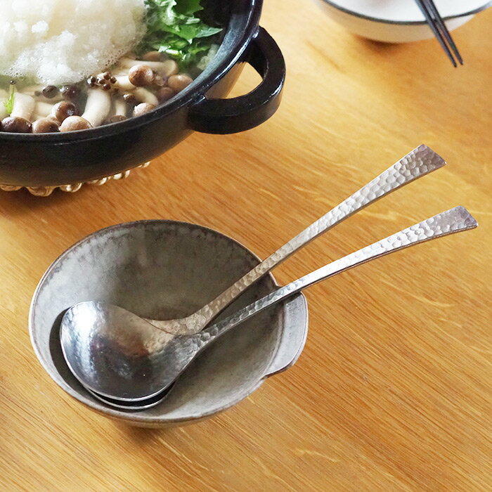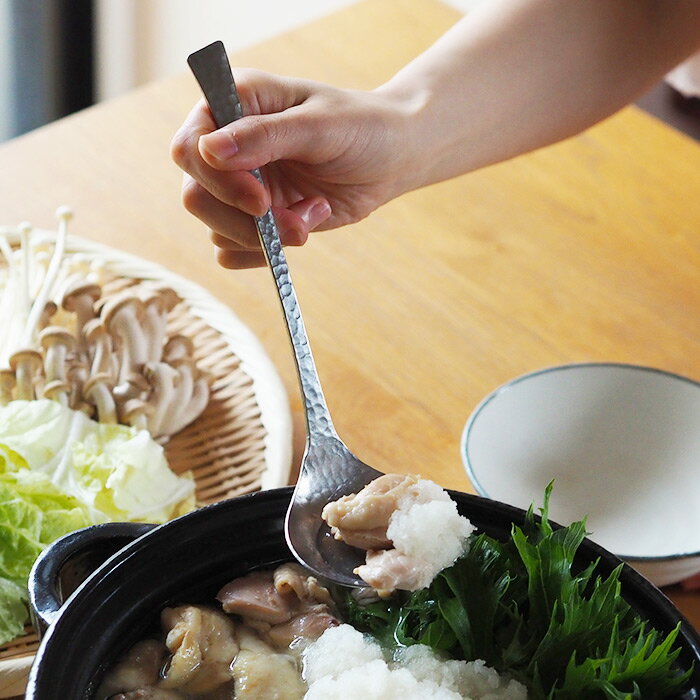 サイズ(目安) 全長21.3cm (すくう部分 6.5×5.8cm) 重さ 77g 材質 18-0ステンレス 使用区分 食洗機 ○ 原産国 日本 ■ご確認ください ●小さな傷や跡、黒ずみ、ムラ、凹凸が見られる場合があります。製造工程のものですので、ご了承ください。 ●一点毎に仕上がりのサイズ・重さなど、異なることがございます。 ●塩分や酸等を含んだ汚れを付着させたまま放置したり、湿気の多い場所での保管はさびの原因となります。 ●ご覧になる環境(PCのモニタやスマホの画面)などにより、色合いが異なって見える場合があります。 写真と実物では色が若干異なる場合がございますのでご了承ください。 ※ラッピングをご希望の方はこちらをご覧ください。草土 WASABI 卓上お玉 / SOHDO 汁気もすくえる小ぶりのお玉 端正なシルエットに表情のある槌目加工を施した草土・WASABIシリーズ。 槌目模様というと錫や銀のカトラリーを想像する方も いらっしゃると思いますが、こちら実は馴染みのあるステンレス製。 新潟燕市で製造されているWASABIシリーズは、 一つ一つ職人が手打ちで仕上げる槌目を金型によってプレス成形し、 ステンレスに手仕事を感じさせる温もりをまとわせた 美しい品のある風合いに仕上げています。槌目の加工と落ち着いた輝きを放つセミマットによって傷が目立ちにく、 水垢や指紋が目立たないのも普段使いに嬉しいところ。 また、槌目のポコポコとした凹凸により手馴染みが良く、 絶妙なフィット感があるため使っているときのストレスがありません。 全体的に薄手で軽い使い心地ですので、 どなたでも扱いやすくゆったりとした食事の時間に優しく寄り添います。 お気に入りに囲まれて、食事の時間を豊かに過ごして欲しいとの思いから、 ラインアップも幅広くセレクトしました。 鍋料理などの取り分けに使う穴あきのお玉。 卓上用のため全体的に小ぶりですが、持ち手がやや長めに作られているため、 鍋底の食材もすくいやすくなっています。 水炊きやキムチ鍋、みぞれ鍋などの鍋料理から、 煮物などの大鉢料理の取り分けにも。 汁気もすくえる卓上お玉とお揃いで使うと、どんな具材にも対応OK。 また、ミルクパンや小さなお鍋をお使いの方には、 一軍のお玉として使っても使いやすさを実感していただけるはず。 お味噌汁、カレーやシチュー、スープなど、いつもの汁物用にもどうぞ。衛生的に使えるつなぎ目のないステンレス一体型。 使い終わったら食洗機での洗浄が可能です。 手洗いの際も普段通り、スポンジに中性洗剤をつけて 洗っていただければ大丈夫です。 目の引くデザインながら飽きがこないため、 今までとは雰囲気の違ったキッチンツールを使ってみたい、 そんな方にもおすすめです。 このシリーズは外国の方にも人気とのこと。 ギフトにもぜひお選びください。
