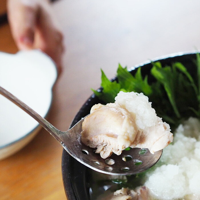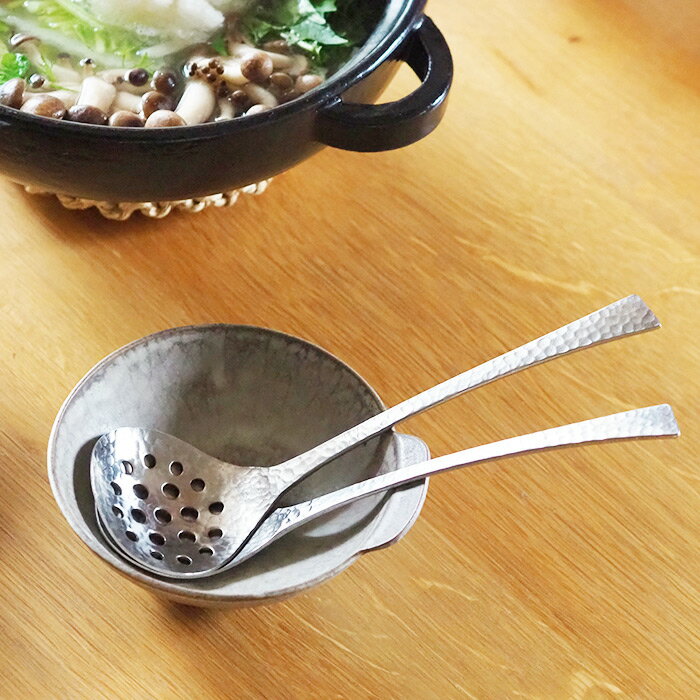 サイズ(目安) 全長21.3cm (すくう部分 6.5×5.8cm) 重さ 68g 材質 18-0ステンレス 使用区分 食洗機 ○ 原産国 日本 ■ご確認ください ●小さな傷や跡、黒ずみ、ムラ、凹凸が見られる場合があります。製造工程のものですので、ご了承ください。 ●一点毎に仕上がりのサイズ・重さなど、異なることがございます。 ●塩分や酸等を含んだ汚れを付着させたまま放置したり、湿気の多い場所での保管はさびの原因となります。 ●ご覧になる環境(PCのモニタやスマホの画面)などにより、色合いが異なって見える場合があります。 写真と実物では色が若干異なる場合がございますのでご了承ください。 ※ラッピングをご希望の方はこちらをご覧ください。草土 WASABI 卓上お玉穴あき / SOHDO 具だけをすくえる小ぶりの穴あきお玉 端正なシルエットに表情のある槌目加工を施した草土・WASABIシリーズ。 槌目模様というと錫や銀のカトラリーを想像する方も いらっしゃると思いますが、こちら実は馴染みのあるステンレス製。 新潟燕市で製造されているWASABIシリーズは、 一つ一つ職人が手打ちで仕上げる槌目を金型によってプレス成形し、 ステンレスに手仕事を感じさせる温もりをまとわせた 美しい品のある風合いに仕上げています。槌目の加工と落ち着いた輝きを放つセミマットによって傷が目立ちにく、 水垢や指紋が目立たないのも普段使いに嬉しいところ。 また、槌目のポコポコとした凹凸により手馴染みが良く、 絶妙なフィット感があるため使っているときのストレスがありません。 全体的に薄手で軽い使い心地ですので、 どなたでも扱いやすくゆったりとした食事の時間に優しく寄り添います。 お気に入りに囲まれて、 食事の時間を豊かに過ごして欲しいとの思いから、 ラインアップも幅広くセレクトしました。 鍋料理などの取り分けに使う穴あきのお玉。 卓上用のため全体的に小ぶりで、穴が大きめに施されているのが特徴です。 みぞれ鍋やすき焼き、湯豆腐などの鍋料理から、 煮物の取り分けまで余分な汁気をさっと切りながら器へ移すことができます。 また、とんすいやボウルに移しやすいカタチのため、 お鍋から器へ注ぐ際もストレスがありません。 卓上お玉と一緒に揃えておくと、おもてなしのシーンなどにも重宝するはず。 他にも茹で野菜の引き上げやフルーツポンチの取り分け、 らっきょうなどの盛り付けも汁気を切りながらできるため、 手の届くところに置いておくと、何かと下ごしらえがはかどります。衛生的に使えるつなぎ目のないステンレス一体型。 使い終わったら食洗機での洗浄が可能です。 手洗いの際も普段通り、 スポンジに中性洗剤をつけて洗っていただければ大丈夫です。 目の引くデザインながら飽きがこないため、 今までとは雰囲気の違ったキッチンツールを使ってみたい、 そんな方にもおすすめです。 このシリーズは外国の方にも人気とのこと。 ギフトにもぜひお選びください。
