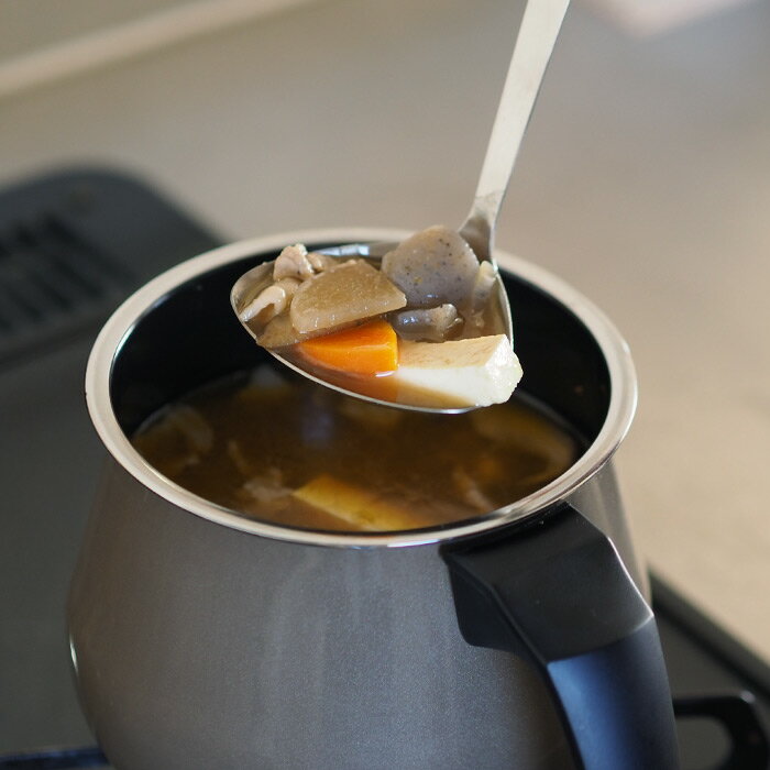 サイズ(目安) 全長:20.3cm 皿部:7.9×6cm 容量(目安) 35ml 重量(目安) 56g 材質 18-8ステンレス 使用区分 食洗機 ○ 原産国 日本 ■ご確認ください ●小さな傷や跡、黒ずみ、ムラ、凹凸が見られる場合があります。また接合部分に凹凸や着色などが見られる場合があります。製造工程のものですので、ご了承ください。 ●お使いのPC・携帯等端末の環境により、実際の製品と画像の色味が若干異なる場合がございます。予めご了承ください。 ※ラッピングをご希望の方はこちらをご覧ください。家事問屋 ハマグリお玉 小 すくいやすく、注ぎやすいハマグリ型の小ぶりのお玉 清潔で機能的。これが家事問屋の台所道具。 常に衛生的に扱える丈夫なステンレス製で 余計な装飾を持たせない端正なデザインが好印象。 それぞれの用途が明確なため使いにくさが全くなく、 使い手目線にこだわった機能性は快適そのものです。 金属加工の産地、燕三条の地に根差す職人さんが生みだす、 働きもので長く付き合える頼もしい道具たちが 日々の台所仕事を楽しい時間に導きます。 丸や楕円ではなくハマグリのような三角形のカタチをしたお玉。 食材やスープをすくう本来の仕事に加えて、 鍋肌や鍋底に沿わせながら具材を寄せて、集めて、が得意です。 角の部分は鋭角気味になっているから、 鍋の隅っこに残っている具材を気持ち良くすくいだしてくれます。 そのうえ、この角を使うと汁が細く流れていくから、 スープジャーやマグカップなどにスープを注ぐ際も ドバっと流れ出る心配がありません。 また、ラタトゥイユのような 具だくさんの料理をお玉ですくおうとすると、 お玉が中まで入りにくく具材が崩れてしまうこともしばしば。 その点でも角の部分が具材の隙間に入り込みやすいから、 もたつかずにサッとすくうことができますよ。 たっぷりすくうことはできるのかな。との心配も無用。 お玉にしっかりと深さを設けているため、 具だくさんのスープもお任せください。 そして、特徴的なのがハンドルの短さ。 卓上でも取り回しのしやすいサイズ感です。 この短さによってお鍋を囲むシーン、取り分けのシーン、 常備菜を器に盛り付けるシーンなど、 活躍の場がグンと広がりました。こちらは容量35mlの小サイズ。 卓上で出番の増えるサイズです。 お玉としてだけでなく取り分けスプーンとして 煮豆などをすくったりにも便利。 他にも小鉢への盛付けや口の狭い容器に盛り付けるときもどうぞ。 左右対称になっているため、 右利きでも左利きでも快適にお使いいただけます。 継ぎ目のないステンレス一体型なので、 汚れが溜まりにくく丈夫で洗いやすい。 使っているうちにパーツが緩くなってきちゃう・・なんてこともなし。 食洗機も使用可能なのでお手入れもラクラクです。 お味噌汁も、スープジャーも、大鉢の取り分けも、 ハマグリお玉ひとつでまかなえちゃいます。 できれば大中小の3サイズ揃えておくと、 サクサクと手際よく作業が進みます。