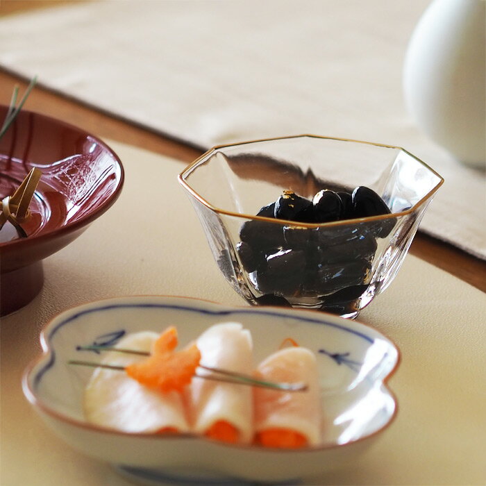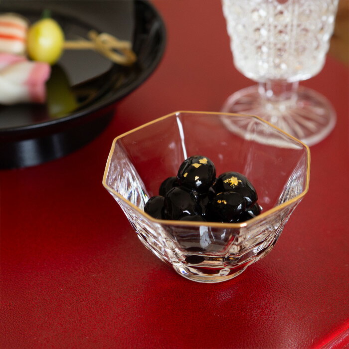 サイズ(目安) φ7.2×H4.1cm 容量(目安) 60ml 重量(目安) 54g 材質 ガラス(ハンドメイド) 使用区分 食洗機 ×、電子レンジ × 原産国 日本 ■ご確認ください ●ガラス製品などには、製造上どうしてもできてしまうポッチや小さな傷、色ムラが見られる場合がございますこのような現象につきましては商品の製造工程および品質上の「仕様」であって「傷・破損」扱いにはなりません。返品・交換の対象となりませんので予めご了承のうえご注文ください。 ●ご覧になる環境(PCのモニタやスマホの画面)などにより、色合いが異なって見える場合があります。 写真と実物では色が若干異なる場合がございますのでご了承ください。 ※ラッピングをご希望の方はこちらをご覧ください。八角盃 金付き 新しい年にやさしく華やぐガラスの酒器 新しい年の幕開けに、 食卓にそっと煌めきと気品を添える ガラスの「八角盃 金付き」。 こちらは口元を金で縁取ったタイプで、 繊細な金の輝きがガラスの透明感と重なり合い、 晴れの日の食卓をより上品に彩ります。 〇 八角形は「末広がり」の縁起の良い形 祝い酒を注げば、 新年の清らかな気持ちやお祝いの場に ぴったり寄り添います。 日本酒や梅酒、純米酒などを注いで、 薄づくりの口当たりの良さを味わってください。 〇 お重と相性の良いサイズ 金の縁取りがあるからといって過度な華美さはなく、 普段使いにもすっとなじむのが魅力です。 もちろん、お重との相性も間違いなし。 重箱の中に収まるサイズ感です。 小ぶりのサイズは酒器や珍味入れとしても使いやすく、 白和えや薬味を盛れば、 食卓にほんのり“ハレ”の景色が広がります。 〇 職人の手で仕上げられたハンドメイドの器 繊細な美しさを長く楽しむために、 使ったあとは手洗いで優しくお手入れしてください。 この八角盃を手に取るたびに、 ガラスの輝きと透明感が食卓を照らし、 何気ない時間が心に残るひとときへと変わっていくはずです。