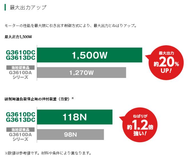 特長 従来品(G3610DA)よりも最大出力が約20%アップし、パワフルな検索作業にも対応できます。 高負荷作業で回転が停止した後、1.5秒以内に不可状態を改善すると自動で回転が復帰します。 小型ヘッド(モータ回りΦ56mm)、コンパクトボディ(握り部周径Φ46mm)で、長時間の作業でも疲れにくいように改良されています。 無段変速ダイヤル・オートモード機能搭載で、用途に応じた回転数の調整が可能です。 三方向にサイドハンドルを取付けられるので、作業の幅が広がりました。 メンテナンスしやすい防塵フィルタ採用で、防じん性が向上しています。 ヘッドの両側に高輝度LEDライト搭載で、暗くて見えないを解消します。 用途 鉄、青銅、アルミ鋳物などのバリ取りおよび仕上げ、溶接・溶断部の研削、さび落しに 塗装面の下地みがき、さび落し、塗料落しに 軟鋼材、カワラ、タイル、石材、コンクリートなどの切断、溝入れおよび研削に 仕様・規格 変速ダイヤル付、ブレーキ付、キックバック軽減システム、再起動防止機能、ソフトスタート、回転復帰制御機能付 電源:DC36V、充電時間:25分(BSL36A18X充電の場合) ブラシレスモーター、サイドハンドル3方向取付可 無負荷回転数(min(の-1乗)):オートモード時5500/変速モード時3200~10000、砥石径(mm):100 本体寸法(mm):全長363×高さ60 バッテリー電圧(V):36、バッテリー種類:マルチボルト蓄電池 全長(mm):363、高さ(mm):60、砥石取付けシャフト寸法(径(ねじピッチ)×長さ):10(1.5)×11mm 1充電当たりの作業量(目安):コンクリート筋付け約7.6m(材質:コンクリート、切り込み深さ20mm) 鉄筋切断約152本(材質:Φ10mm鉄筋) 質量・質量単位 2.5kg セット内容・付属品 蓄電池(BSL36A18X)×2個(おまけ蓄電池(BSL36A18X)×1個)計3個 急速充電器(UC18YDL2)、システムケース3、100mmレジノイドフレキシブルトイシ 防振サイドハンドル、ツールレスホイルガード、ホイルナット、スパナ、ホイルワッシャ(ダイヤ用)