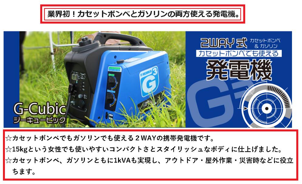 【在庫あり・当日発送・新品です】ニチネン 2way インバータ式 携帯 発電機G-cubic(ジーキュービック) KG-101カセットボンベとガソリンの両方が使えます!!※メーカー保証有 ※沖縄、離島への発送は行っておりません。