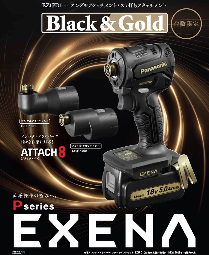 【限定色、在庫あり、当日出荷・おまけ付きのフルセット】パナソニック EXENA インパクトドライバー限定色ブラック&ゴールドEZ1PD1T1G 18V 5.0Ah電池パック2個・充電器・ケーススミ打ちアタッチメント・アングルアタッチメント付