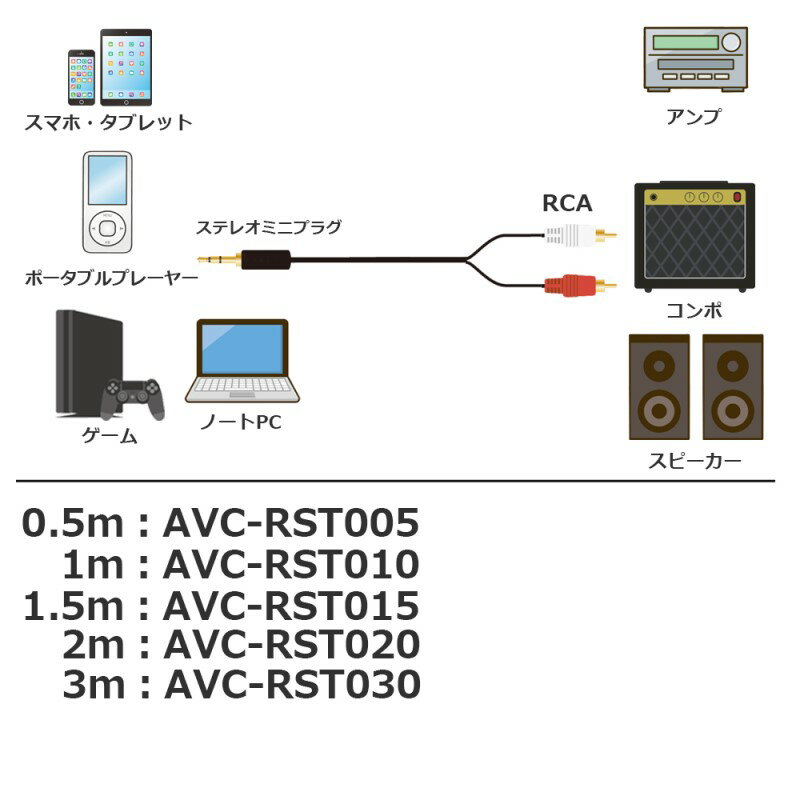 オーディオケーブル RCA - φ3.5mm 変換ケーブル 1m ステレオミニプラグ AUX 高音質対応 スマホ タブレット PC スピーカー用 3Aカンパニー AVC-RST010 【メール便送料無料】