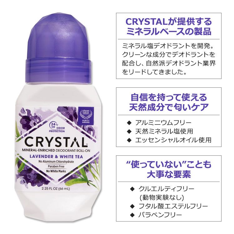 【最大10%OFFクーポン】クリスタル ミネラル デオドラント ロールオン ラベンダー&ホワイトティー 66ml (2.25floz) CRYSTAL Mineral Deodorant Roll-On Lavender & White Tea パーソナルケア アルミニウムフリー