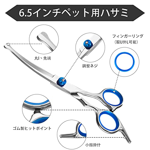 【ペット専用カーブシザー】カーブシザーは、ただ短かくするだけではなく、丸みを帯びたカットなど、トリミングが可能です。ペットはさみの刃先が丸いのでペットを痛めることもありません。刃がカーブしているため、胴体の局面が出しやすくて、顔や足周りなどの細かい作業が簡単にできます。【上下向き兼用&人間工学に基づいたデザイン】指リング部分を動かしやすいシンメトリー(左右対称)ツイスト状なので表裏がなく正刃でも逆刃でも使えます。指を入れる部分には、指リングと衝撃吸収のゴムを配置しており、長時間カットでも手が疲れにくい作りとなっています。 取り外し可能、指のサイズに合わせて使えます。【高耐用性】高品質ステンレス製で錆びにくくて、ハサミの良い切れ味を長くて保つので、耐久性があり、長期にご使用することができます。【お手入れ簡単】汚れてもそのまま水洗いできるからお手入れラクラク!切れ味は良く、使いやすいで、初心者でも問題ありません。【様々な犬種に対応】大きい犬種やボディラインが切りやすい、小さい犬種や顔周り・足回り、大きさや毛足の長さに関係なく、どのワンちゃんにもご使用頂けます。説明 【仕様】 色:シルバー、ブルー 素材:ステンレス鋼 重さ:60g 【特徴】 【調節ネジ付き】 カーブシザーズ(ハサミ)はセンターのネジで刃の締まり具合が調節可能。ペットの毛量に合わせて、切れ味を細かく調整できる。 【切れ味抜群】 トリミングハサミの刃はステンレスの材質で、錆びにくて、切れ味がよく、スパッと切れると同時に、切った毛が飛び散りにくい仕様です。 【刃先が丸型】 刃先は安全性を考慮した丸みを帯びたデザインです。ワンちゃん猫ちゃんが急に動いても傷つくのを防ぐことができる犬用ハサミ。 はさみのお手入れ方法 1.高品質の鋼、高い切れ味、はさみを使用するときは安全に注意する必要があります。 2.使用後は清潔に保ち、必要に応じて注油してください。 3.ハサミは慎重に使用してください。高い場所から落下しないでください。ハサミのエッジの適応性が損なわれます。 4.金属製品の切断には使用しないでくださいはさみは髪を切るためにのみ使用できます。切断しないと、寿命が短くなります。