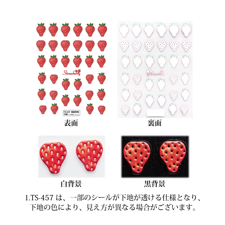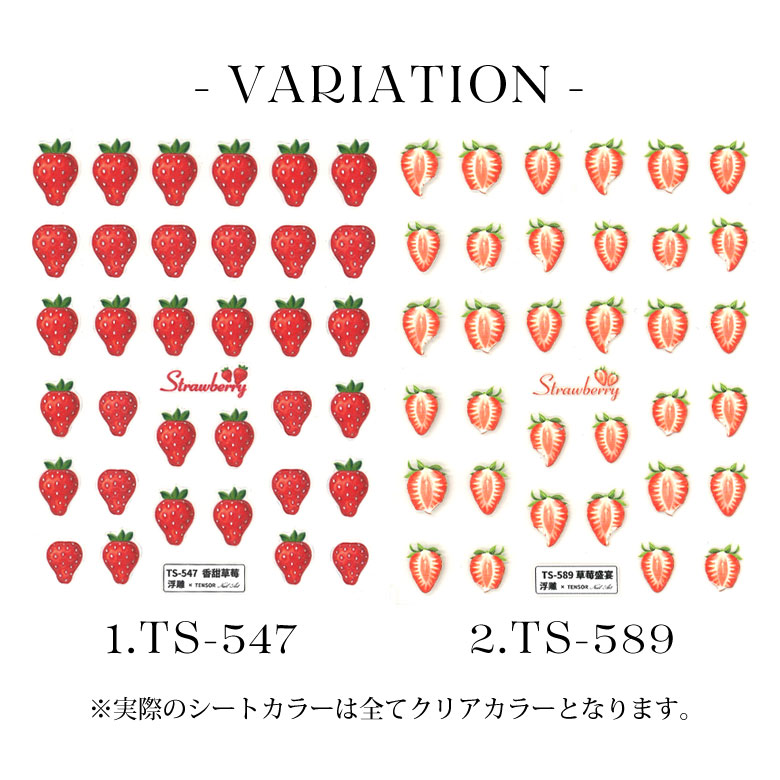商品について 特徴 ぷっくりとした、立体的なイチゴが可愛いネイルシール! ガーリーなネイルやフルーツネイルにぴったり♪ シールの上からクリアジェルを乗せると、より立体的な仕上がりになります! ネイルのワンポイントはもちろん、レジン封入やデコ等にも◎ ご使用の際は、ピンセットなどでシールのはしを持って台紙からゆっくり丁寧にはがし貼ってください。 バリエーション 1.TS-547 2.TS-589 サイズ・枚数 サイズ:約8cm×10.3cm前後 枚数:1枚入り ※シートサイズは多少異なる場合がございます。 ※実際のシートカラーは全てクリアカラーとなります。 その他 *台紙から剥がす際にシールが切れてしまう場合がございますので、ご注意ください。 *生産ロットにより、色味や色の濃淡が多少異なる場合がございます。 *お客様ご自身で選択頂きました商品送付の際にかかる送料により、ご購入商品の破損・紛失等の補償についての有無がございます。 *モニターや環境などにより、商品写真と実際の商品の色合いが異なる場合がございます。 関連商品 ・ノンワイプトップジェル 大容量15ml ・ネイル ジュエリービジューパーツ 11 2個入り ・ネイル レジン デコ カット フルーツ ミックス 大 20個入り ・スライス棒はこちら ・その他3D・ラバータイプのネイルシールはこちら