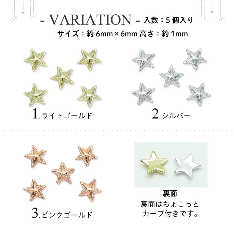 商品について 特徴 かわいい星型のメタルパーツ! 色々なネイルのワンポイントにピッタリなサイズ感です♪ クリスマスツリーの星やリースのワンポイントにも◎ レジン封入やアクセサリー制作にも使えます。 バリエーション 1.ライトゴールド 2.シルバー 3.ピンクゴールド サイズ・入数 サイズ:約6mm×6mm 高さ:約1mm 入数:5個入り その他 *メッキ商品のため、商品によりバリ等がある場合がございます。 *生産ロットにより、サイズや色味が若干異なる場合がございます。 *モニターや環境などにより、商品写真と実際の商品の色合いが異なる場合がございます。 関連商品 ・ネイル メタル パーツ ステッチ スター 3D スタッズ 5個入り 128 ・メタルパーツ ブライトシリーズ 各種 5個入り ・ネイル メタル スター/ムーン/クロス 5個入り 各種 ・ブリオンはこちら ・その他メタルパーツはこちら
