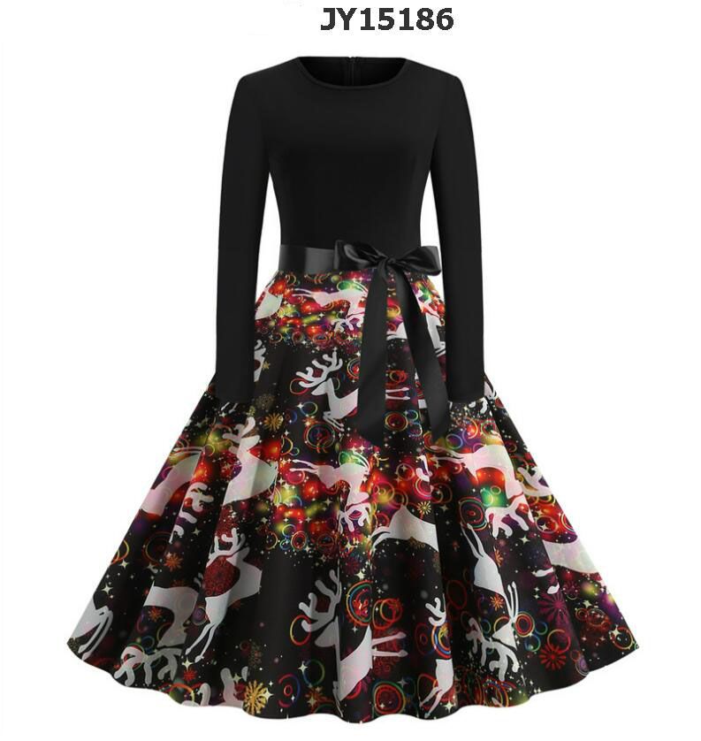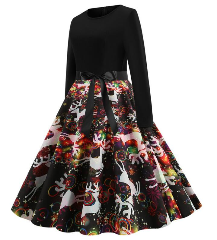 クリスマス 衣装 大きい裾 ワンピース レディース 長袖 クルーネック フレア レトロワンピース リボン 可愛い パーティー ロングドレス サンタ トナカイ 雪だるま ツリー プリント 大人 舞台ステージダンス衣装 団体服 コスプレ衣装 黒系 S M L XL XXL