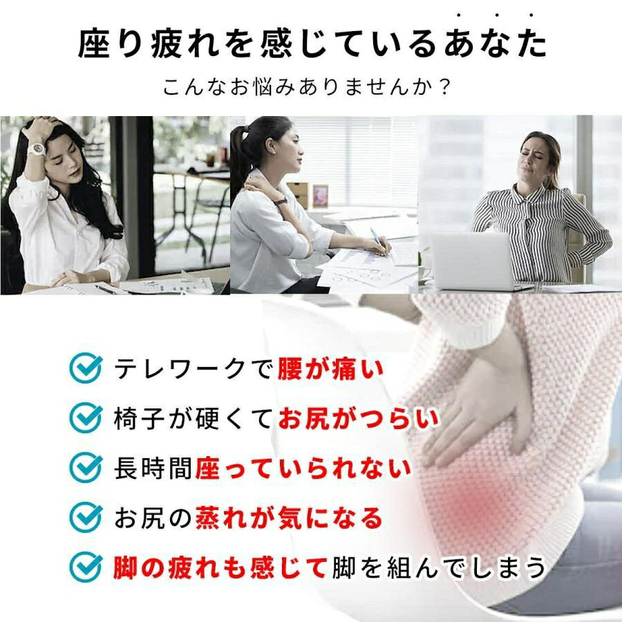 整体師/柔道整復師/多くのお客様よりご支持頂いております。 【姿勢を美しくするフォルム】 3D形状の流線型のフォルムにより、骨盤ゆがみの改善が期待できます。座るだけで自然に前傾する姿勢を保ち、背 筋が自然と伸びることで無理なく正しい姿勢へ導きます。 【人間工学デザイン】 お尻と太ももの形状にやさしくフィットします。臀部や太ももへの圧力を吸収・分散させ、長時間座っても疲れに くく、お尻の痛みを気にせず快適な座り心地の健康クッションです。オフィス / 車のシート / 車椅子 / デスク な ど様々な場所で利用可能。 【3Dフィット健康クッション】 ■約43 x 38×10cm 重量約700g ※商品は折りたたまず綺麗な状態で出荷致します。