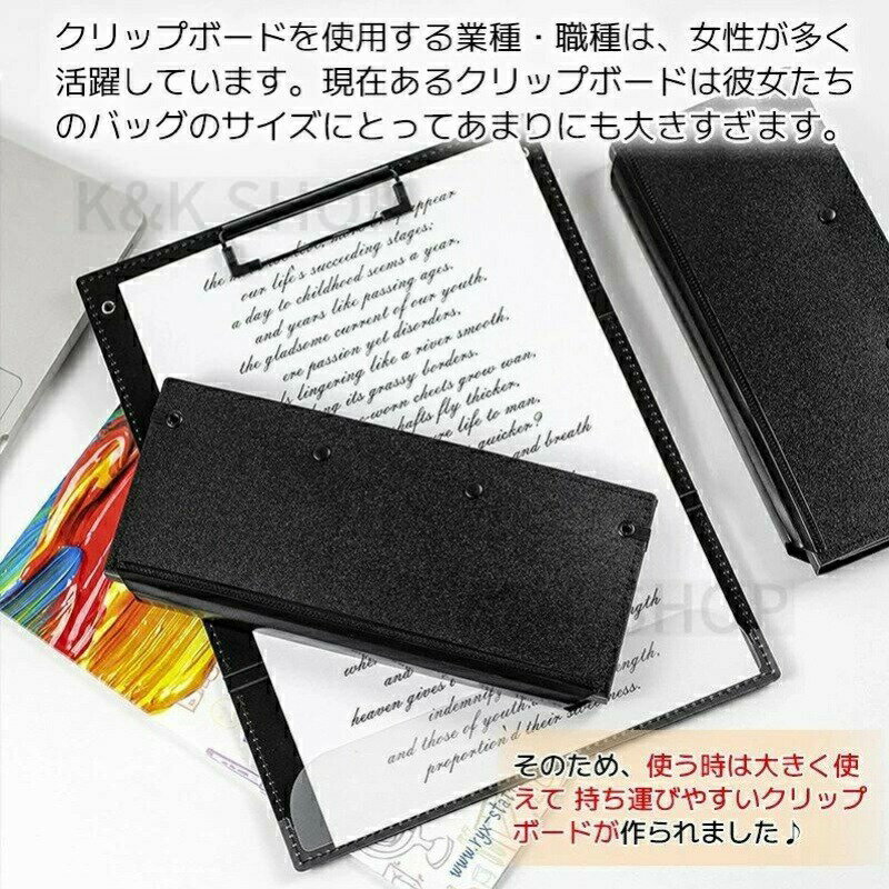 クリップボードを使用する業種職種は、女性が多く活躍しています。現在あるクリップボードは彼女たちのバッグのサイズにとってあまりにも大きすぎます...そのため、使う時は大きく使えて 持ち運びやすいクリップボードが作られました♪丈夫な金属製クリップを採用し、グリップ力が高いので書類をしっかり挟み込み落ちにくいです。収納時に隙間があり、折れ跡がそれほど目立たなくなり、また、折りたたむことにより大切な資料の内容を隠せるメリットもあります。コピー用紙が折れて収納してから上に向いてる傾向がありますから、下の固定ベルトで固定してなめらかに書くことができます。ゴムバンドでしっかり固定、カバンに収納しているときも資料を散らかさなく、持ち歩きラクラク♪