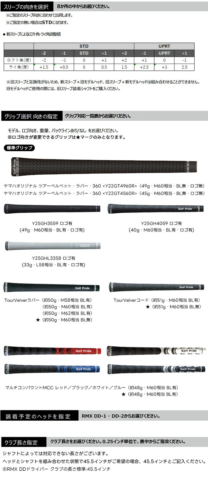 ※シャフト単体のご購入はカスタムオーダーにて可能です。 ※スリーブ及びウェイトは従来モデルとの互換性はありません。 メーカー希望小売価格はメーカーカタログに基づいて掲載しています スリーブ付きシャフト単体のページになります。 ※クラブのヘッドはついていません。 <グリップに関する注意事項> ・ バックラインなしのグリップはロゴ向きをご指定ください。 ご指定がない場合は全てのロゴ向きは【おもて】で作製いたします。 ・ バックラインありのグリップはロゴ向きのご指定は対応できかねます。 ・ M62口径のグリップをお選びいただく場合は、シャフトのテーパー度合いによってはグリップ口先端部分に隙間ができる場合がございます。 (バット部分が固定されるため、安全性には問題ございません) ・ ゴルフプライド社製グリップの記載重量は、バックラインありの重量です。 ※バックラインなしは通常重量より-1gとなります。 ※在庫状況により対応できない場合がございます。 ・ グリップ重量が5g変化すると、クラブバランスは1ポイント変化します。 ・ グリップを変更すると、クラブ総重量やクラブバランスが変化します。 例:グリップ重量が5g増加すると、クラブバランスは約1ポイント減少します。 ・ グリップを変更すると、太さや握った感触が変化する場合があります。 ・ グリップ下巻テープのらせん巻は対応できかねます。 ・ シャフトカットをしない状態でのご注文は対応できかねます。 ・ クラブ総重量、シャフト振動数のご指定は対応できかねます。 【DRIVER/FW/UT】 クラブ長さは0.25インチ刻みでご指定いただけます。(一部対応不可モデルがございます。)