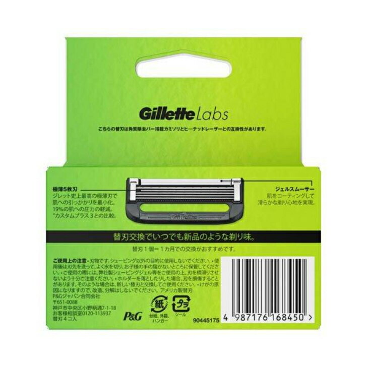 【商品名】 P&G ジレットラボ 角質除去バー搭載 替刃 4個入り Procter & Gamble Gillette Labs 【メーカー】 P&G ジレット 【内容量】 極薄5枚刃/替刃4個入 【商品説明】 ・極薄刃で肌への引っかかりを少なく。 ・19%の肌への圧力の軽減。 ・カスタムプラス3との比較。 ・ジェルスムサーで滑らかな剃り心地を実現。 ・本製品の箱は紙を使用しております。 ・120年の精密さと技術の結晶。